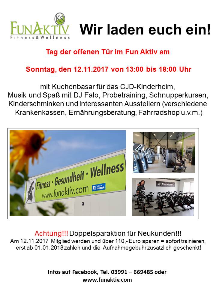 Zur Erinnerung: Das Warener Fitnessstudio „FunAktiv“ von Kristin Schmuck hat für den morgigen Sonntag einen Tag der offenen Tür mit umfangreichem Programm organisiert.