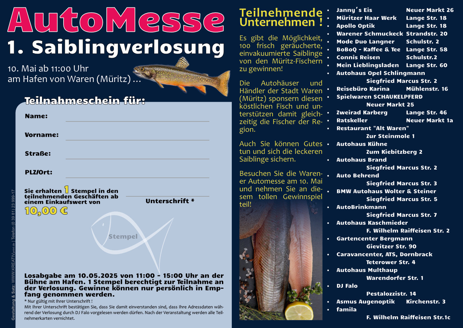 Am kommenden Wochenende spielen am Warener Hafen nicht die Boote die Hauptrolle, sondern vor allem die neuesten Automodelle, Caravans und Bikes. Am Sonnabend, 10. Mai, um 11 Uhr startet wieder die beliebte Automesse, bei der die Besucher nicht nur viel anschauen können, sondern bei der es drumherum jede Menge Unterhaltung gibt. Außerdem zum ersten Mal: Die Veranstalter verlosen 100 frisch geräucherte Saiblinge von den Müritzfischern. Dafür müssen die Gäste lediglich zuvor für zehn Euro bei den unten stehenden Geschäften einkaufen und ihre abgestempelten Karten, die man auch hier bei „Wir sind Müritzer“ ausdrucken kann, in den Lostopf werfen.
