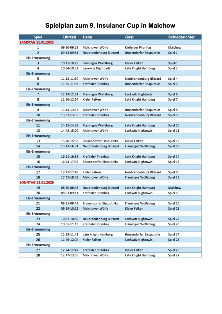 Beim inzwischen 9. Insulaner-Cup in der Eishalle Malchow treffen am kommenden Wochenende, 11. und 12. Januar, acht norddeutsche Eishockey-Mannschaften in 28 Spielen aufeinander. Die Gastgeber „Malchower Wölfe“ begrüßen Teams aus Krefeld, Wolfsburg, Kiel, Hamburg, Neubrandenburg, Lankwitz und Brusendorf.