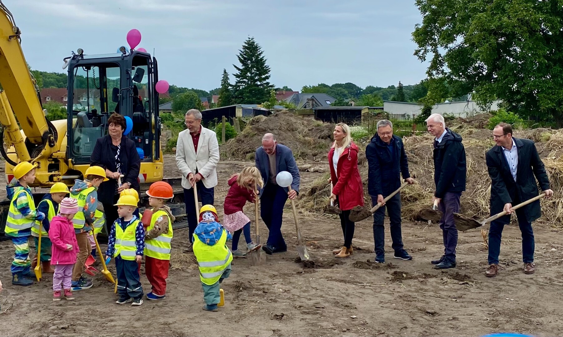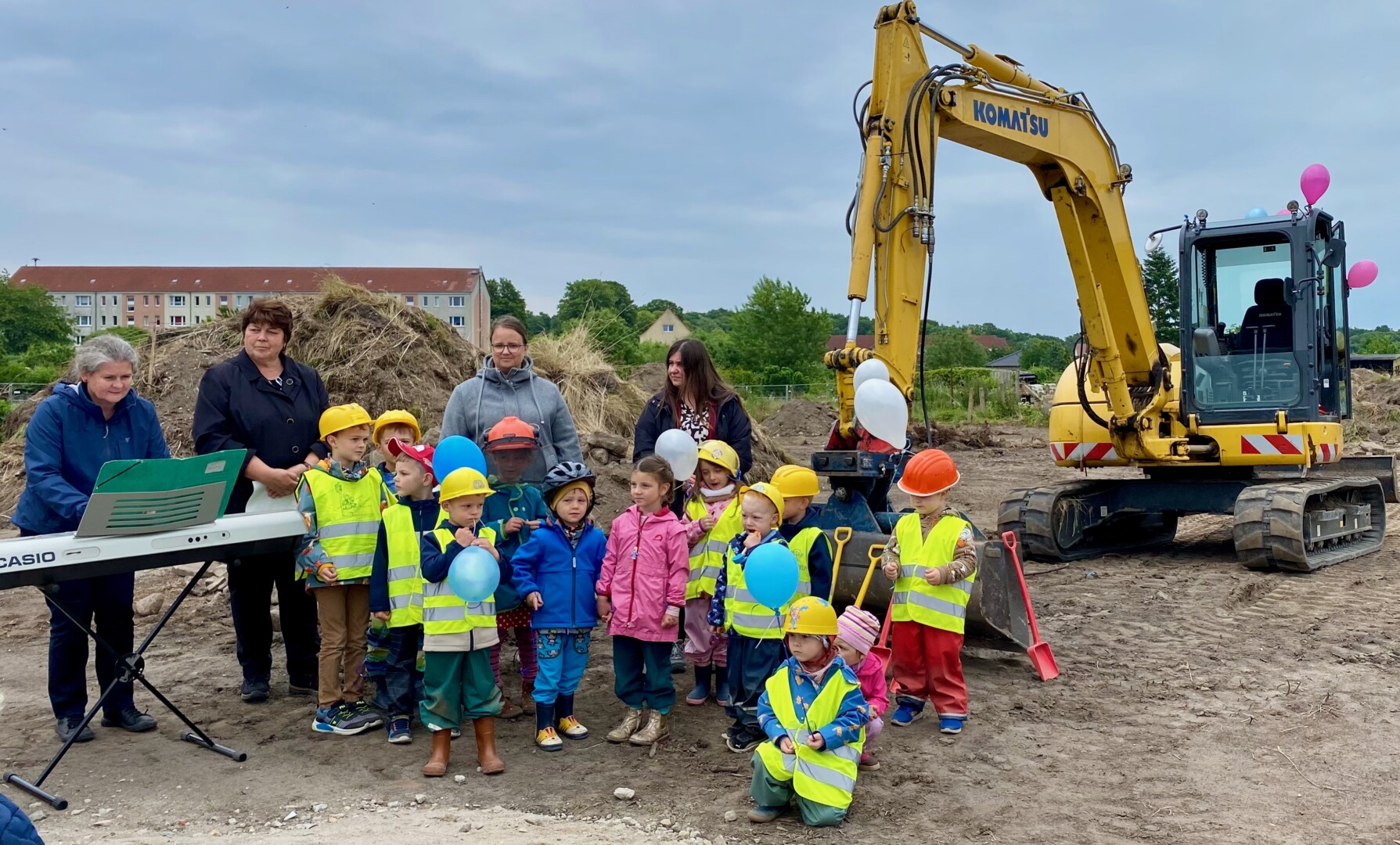Endlich! Erster Spatenstich für den Kita-Ersatzneubau der Evangelischen Kita „Simon unter`m Regenbogen“ in Trägerschaft der Diakonie Mecklenburgische Seenplatte in Penzlin. „Wer ein Haus bauen will, der braucht…“, so schallte es über das Baugrundstück, die Kinder der Kita in Penzlin eröffneten mit einem kleinen musikalischen Programm diesen feierlichen Anlass. Langersehnt wurde jetzt der Startschuss für das Bauprojekt gegeben. Die ersten Bagger sind schon auf dem Grundstück angerückt und haben mit der Freimachung des Baufeldes begonnen.