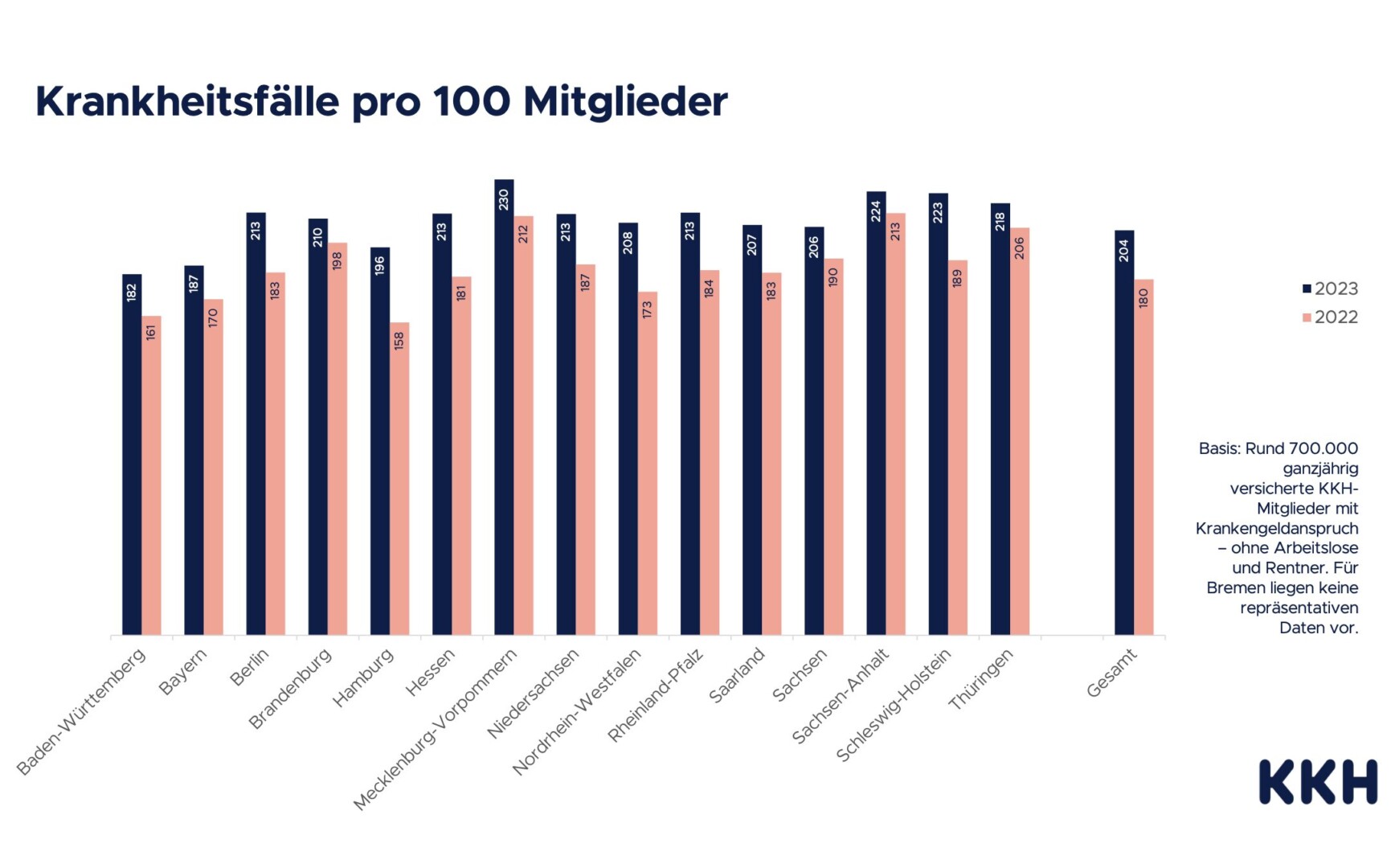 Die krankheitsbedingten Ausfälle im Job sind 2023 weiter gestiegen – für Unternehmen und Institutionen neben Fachkräftemangel und Energiekrise eine große Herausforderung. Die KKH Kaufmännische Krankenkasse registriert in Mecklenburg-Vorpommern für das vergangene Jahr 230 Krankheitsfälle pro 100 Mitglieder, also fast neun Prozent mehr als noch im Vorjahr (212 Fälle). Im Bundesländervergleich ist das der höchste Wert. Das bundesweite Mittel liegt bei 204 Fällen. Die durchschnittliche Fehlzeit pro Fall ist wiederum von 13,2 auf 12,3 Tage gesunken. Somit haben Angestellte im vergangenen Jahr mehr kurzzeitige Krankschreibungen eingereicht als zuvor. Auch hier liegt das Bundesland über dem deutschlandweiten Schnitt von 11,7 Tagen.