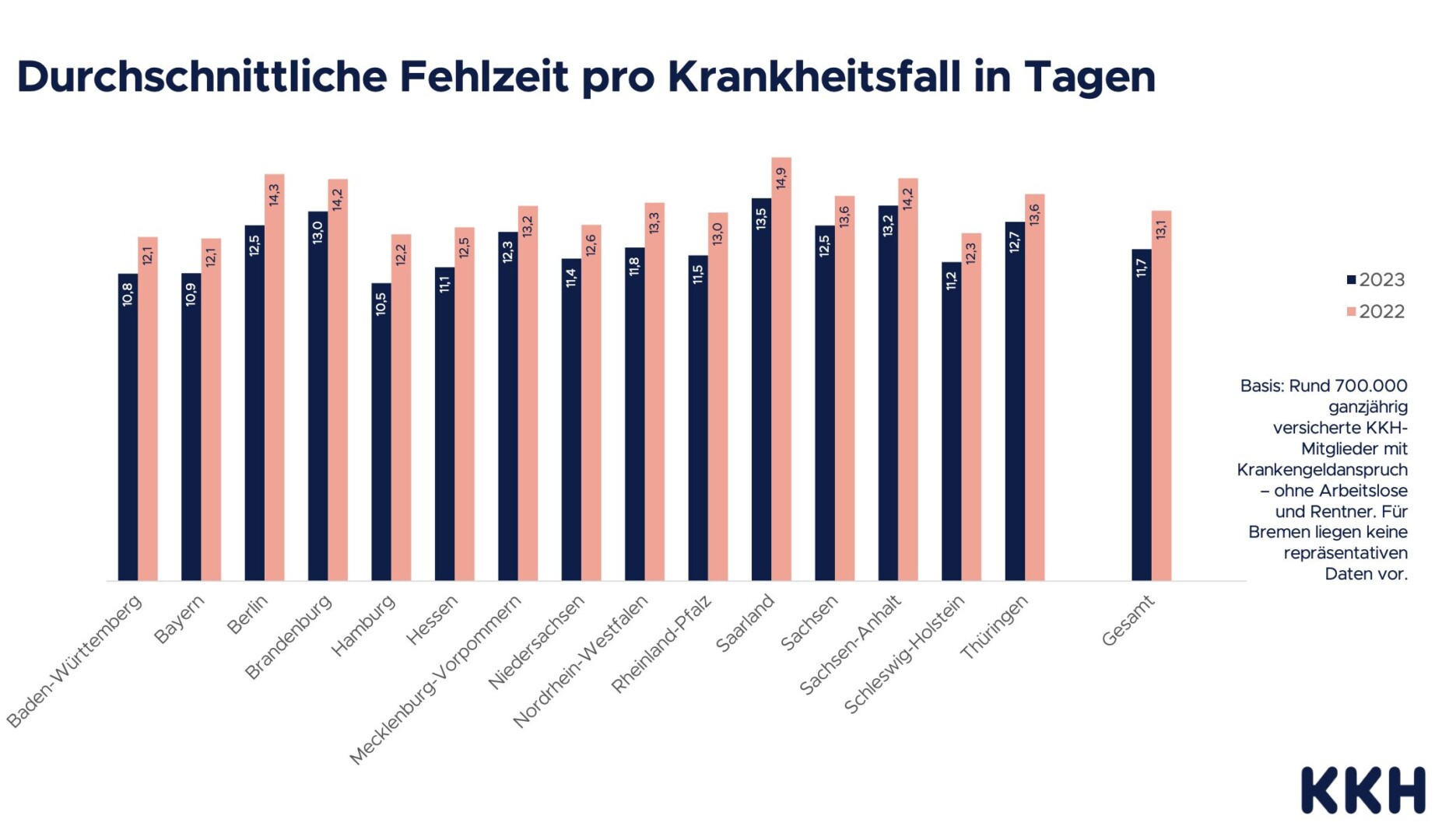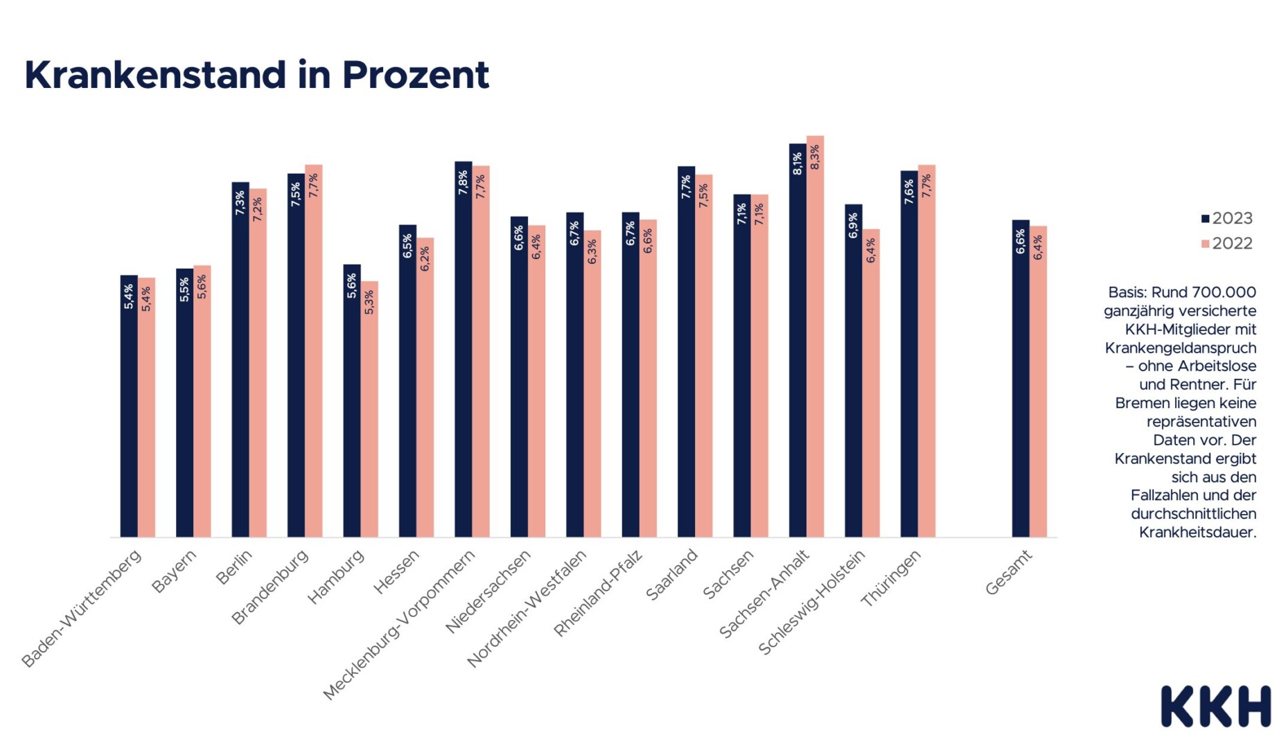 Aus diesen Daten ergibt sich in MV für 2023 ein nahezu gleichbleibend hoher Krankenstand von 7,8 Prozent (2022: 7,7 Prozent). Das heißt, an jedem Tag des vergangenen Jahres waren dort 7,8 Prozent der Beschäftigten krankgeschrieben. Im Ländervergleich liegt der Nordosten damit an zweiter Stelle. Den höchsten Krankenstand für 2023 verzeichnet die KKH mit 8,1 Prozent in Sachsen-Anhalt, den niedrigsten mit 5,4 Prozent in Baden-Württemberg. Der Bundesdurchschnitt liegt bei 6,6 Prozent.