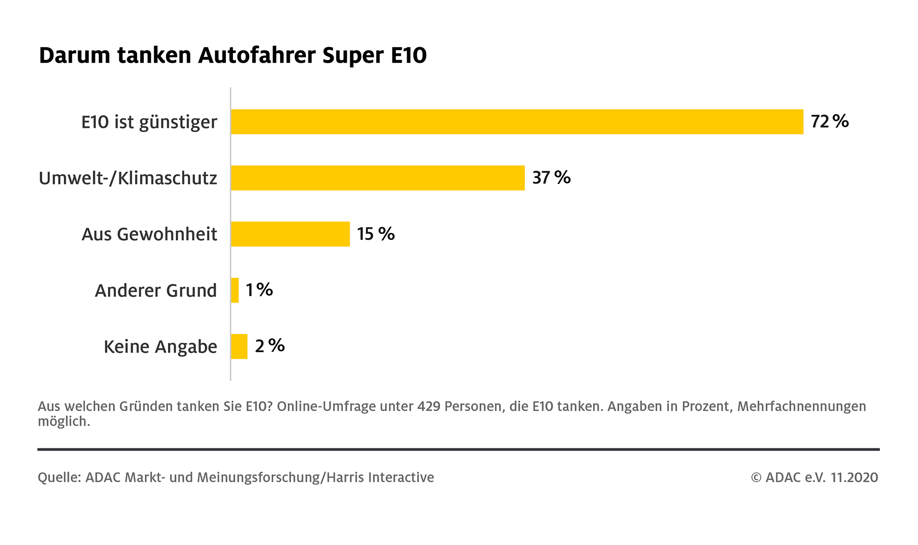 Der vergleichsweise niedrige Preis von Super E10 – im deutschlandweiten Schnitt kostet ein Liter derzeit ca. fünf Cent weniger als Super – ist für 72 Prozent derjenigen Befragten ausschlaggebend, die E10 tanken. Und immerhin 37 Prozent der E10-Tanker geben an, den Kraftstoff aus Umwelt- und Klimaschutzgründen zu wählen. ADAC Technikpräsident Schulze: „E10 lohnt sich – für jeden Einzelnen, dessen Fahrzeug dafür geeignet ist. Jeder, der E10 tankt, leistet einen Beitrag zum Klimaschutz und spart dabei Geld.“