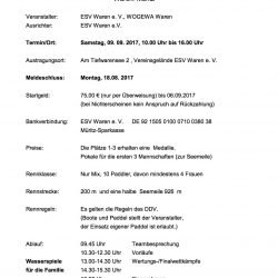 Der Wettkampf wird im Funbereich mit jeweils 10 Paddlern – 6 Männer und 4 Frauen – in einem Boot ausgerichtet. Der ESV Waren e.V. bietet im Vorfeld Trainingseinheiten an. Anmeldungen bitte telefonisch über Ingo Warnke 03991/6227-0 oder 0171/ 6420438 oder i.w@ingo-warnke.de.