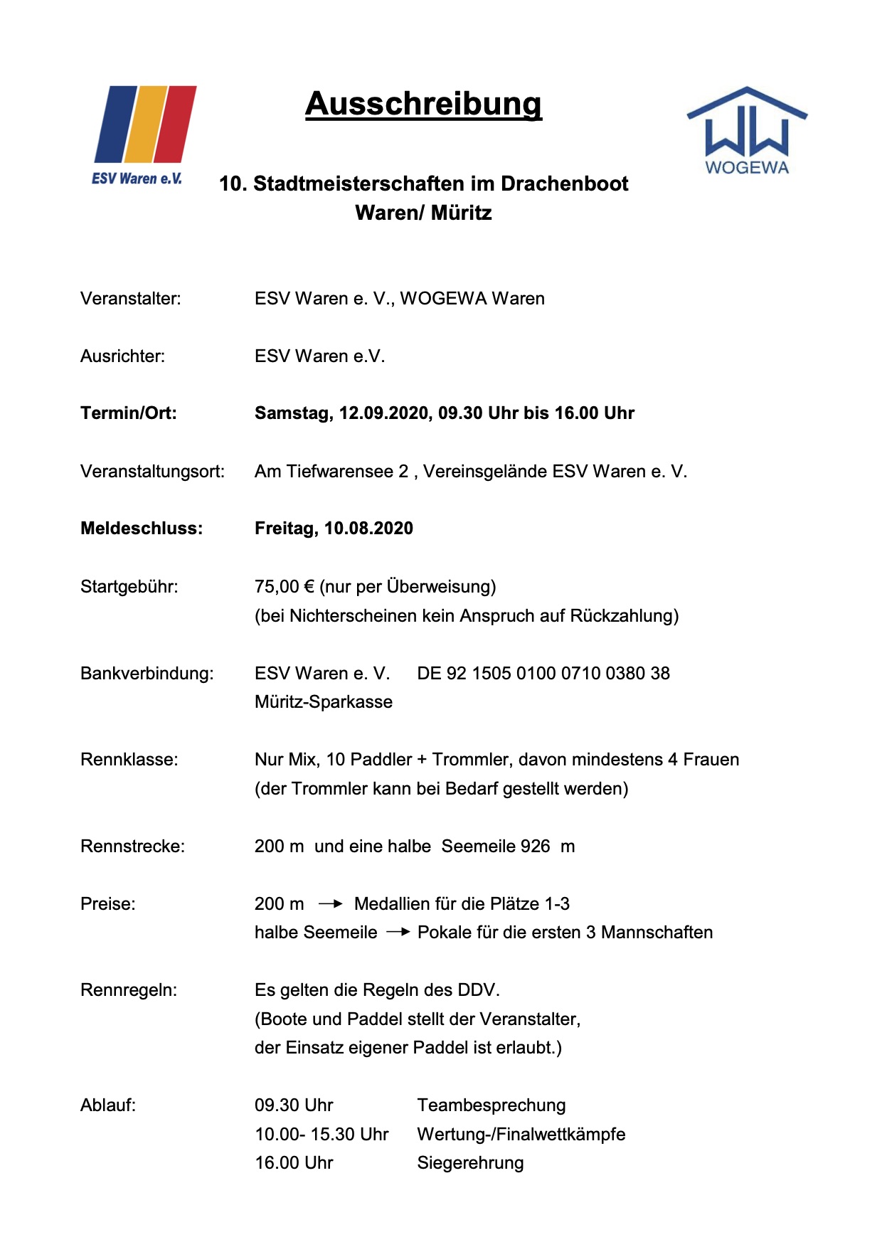 Trotz Corona: Zum nunmehr schon zehnten Mal starten am 12. September um 9.30 Uhr auf dem Tiefwarensee die Stadtmeisterschaften im Drachenboot – veranstaltet vom ESV Waren und der Wohnungsbaugesellschaft Waren (WOGEWA).