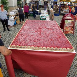 Tolles Ergebnis: Beim „Gemeinsamen tafeln“ auf dem Neuen Markt in Waren sind heute 4234 Euro zusammen gekommen und damit so viel wie noch nie. Einen großen Anteil daran dürfte im wahrsten Sinne des Wortes der riesige Erdbeerkuchen haben, den die Stadtbäckerei Kowalewski zusammen mit Torsten Behnke von „So ein Früchtchen“ aus Waren präsentiert hat.