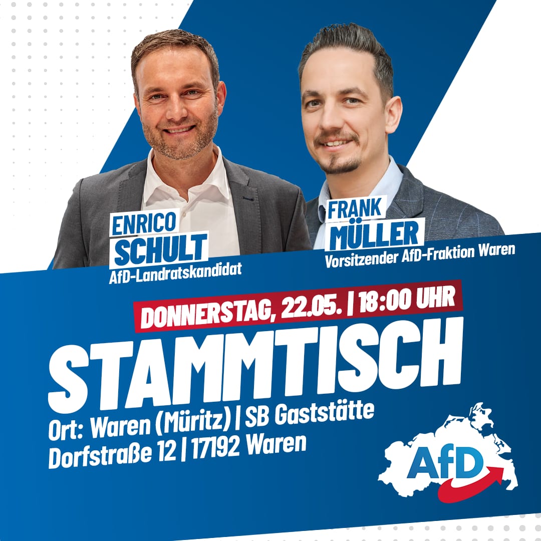 Der Wahlkampf geht in die letzte Runde, am Sonntag, 25. Mai, können sich die Einwohner des Landkreises Mecklenburgische Seenplatte für einen neuen Landrat entscheiden. Der AfD-Kandidat Enrico Schult, der im ersten Wahlgang mit 36,1 Prozent die meisten Stimmen geholt hat, ist am morgigen Donnerstag, 22. Mai, in Waren unterwegs. Von 15 bis 17 Uhr steht er an einem Infostand am Hafen Rede und Anwort. Ab 18 Uhr lädt er gemeinsam mit Frank Müller, Vorsitzender der AfD-Stadtfraktion, zu einem Bürgerdialog in die SB-Gaststätte in Warenshof, Dorfstraße 12, ein.