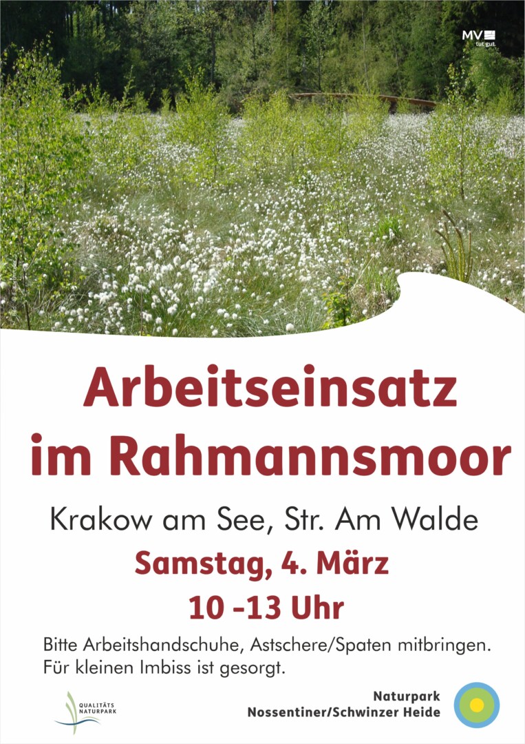 „Moor muss nass!“ ist das Motto des Arbeitseinsatzes des Naturparks Nossentiner/Schwinzer Heide. Der Arbeitseinsatz findet am Samstag, 4. März, im Rahmannsmoor bei Krakow am See statt. Ziel ist, dem Moor zu mehr Wasser zu verhelfen, indem die aufwachsenden Gehölze entfernt werden. Helfende Hände sind gern willkommen.
