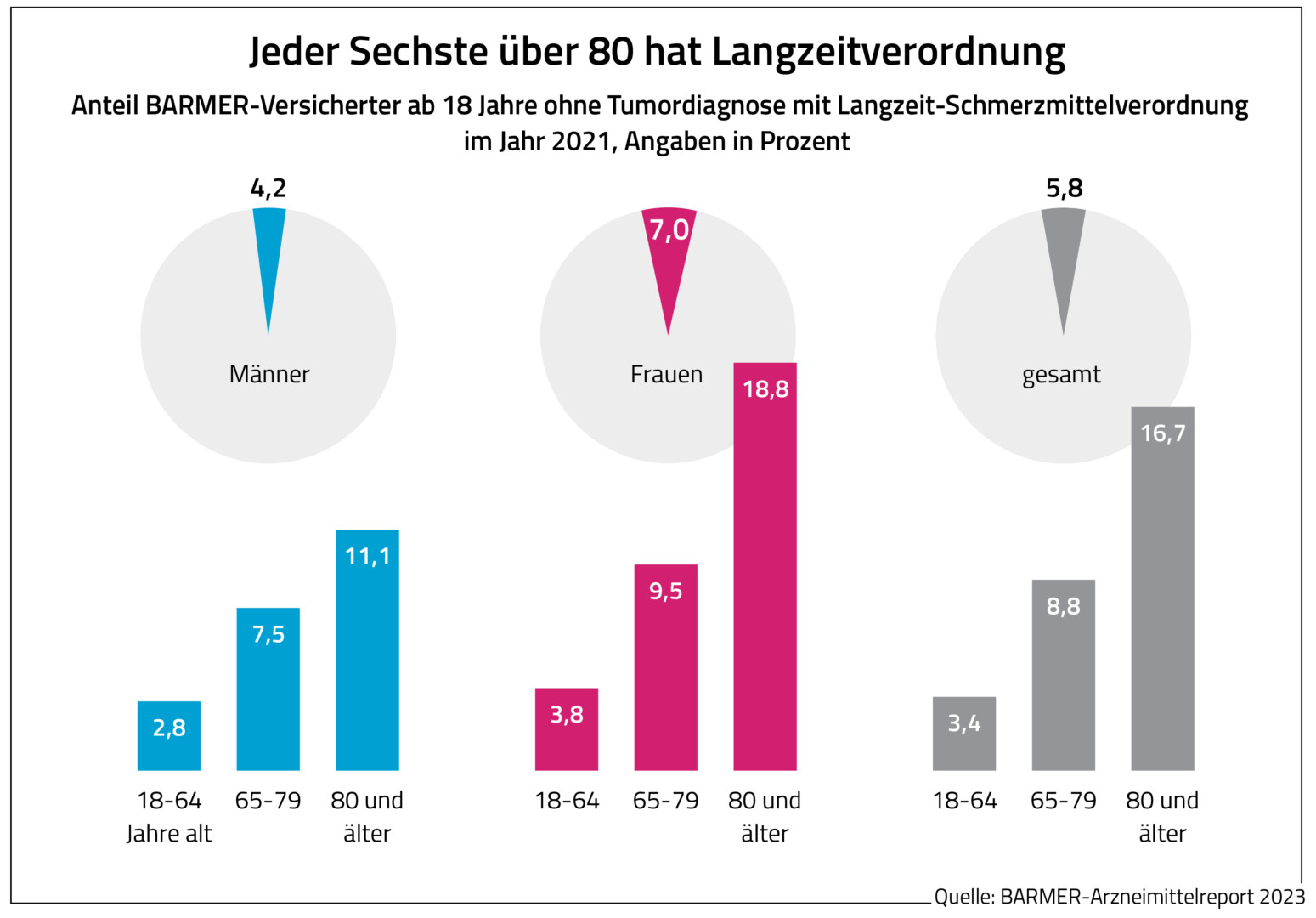 Dies wäre vermeidbar, wenn Abführmittel bereits vorsorglich verordnet und eingenommen würden“, sagte Studienautor Prof. Dr. med. Daniel Grandt, Chefarzt am Klinikum Saarbrücken. Beim Einsatz von sehr starken Schmerzmitteln gebe es weitere Risiken. So sollten Opioide nicht zusammen mit Beruhigungsmitteln, sogenannten Tranquilizern, angewendet werden, weil die Gefahr schwerer Nebenwirkungen bis hin zu vermehrten Todesfällen drohe. Dennoch habe rund jeder zehnte, beziehungsweise 40.100 Barmer-Versicherte, mit einer Opioidverordnung entgegen der Leitlinienempfehlungen zugleich ein Beruhigungsmittel erhalten. Hier würden Patienten vermeidbar gefährdet.