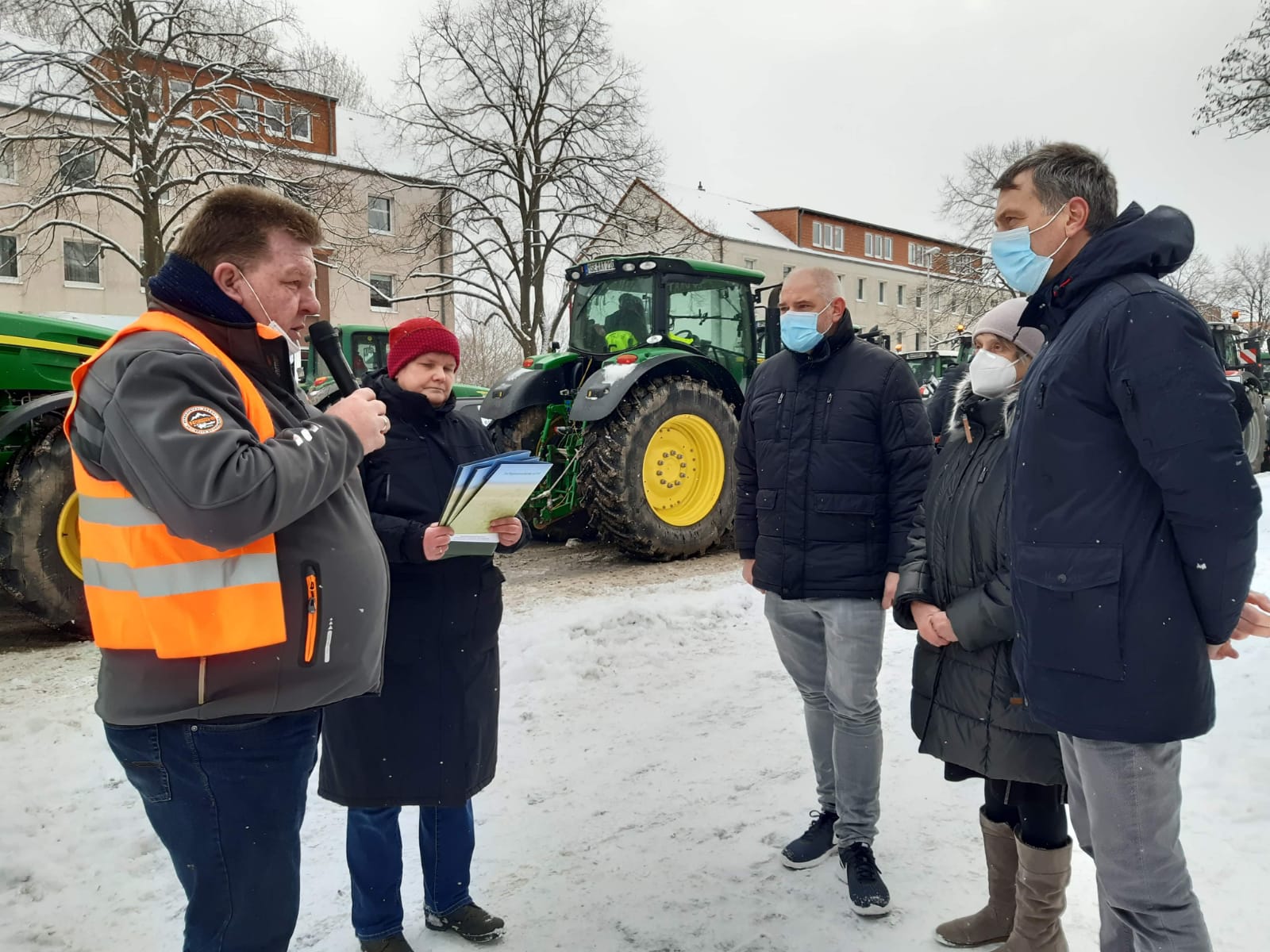 Die Demonstrationsroute führte auch zum Wahlkreisbüro von Bundeskanzlerin Angela Merkel. Dort wurde ein Brief übergeben. Agrarminister Till Backhaus äußerte Verständnis für die Landwirte. Durch Verhandlungen seien einige Verbesserungen gelungen. So könne nach dem jetzigen Gesetzentwurf Saat- und Pflanzgut sowie Sonderkulturen im Obst- und Gemüsebau auch weiter mit Pflanzenschutzmitteln behandelt werden. Hier hätte ein generelles Verbot fatale Auswirkungen gehabt.