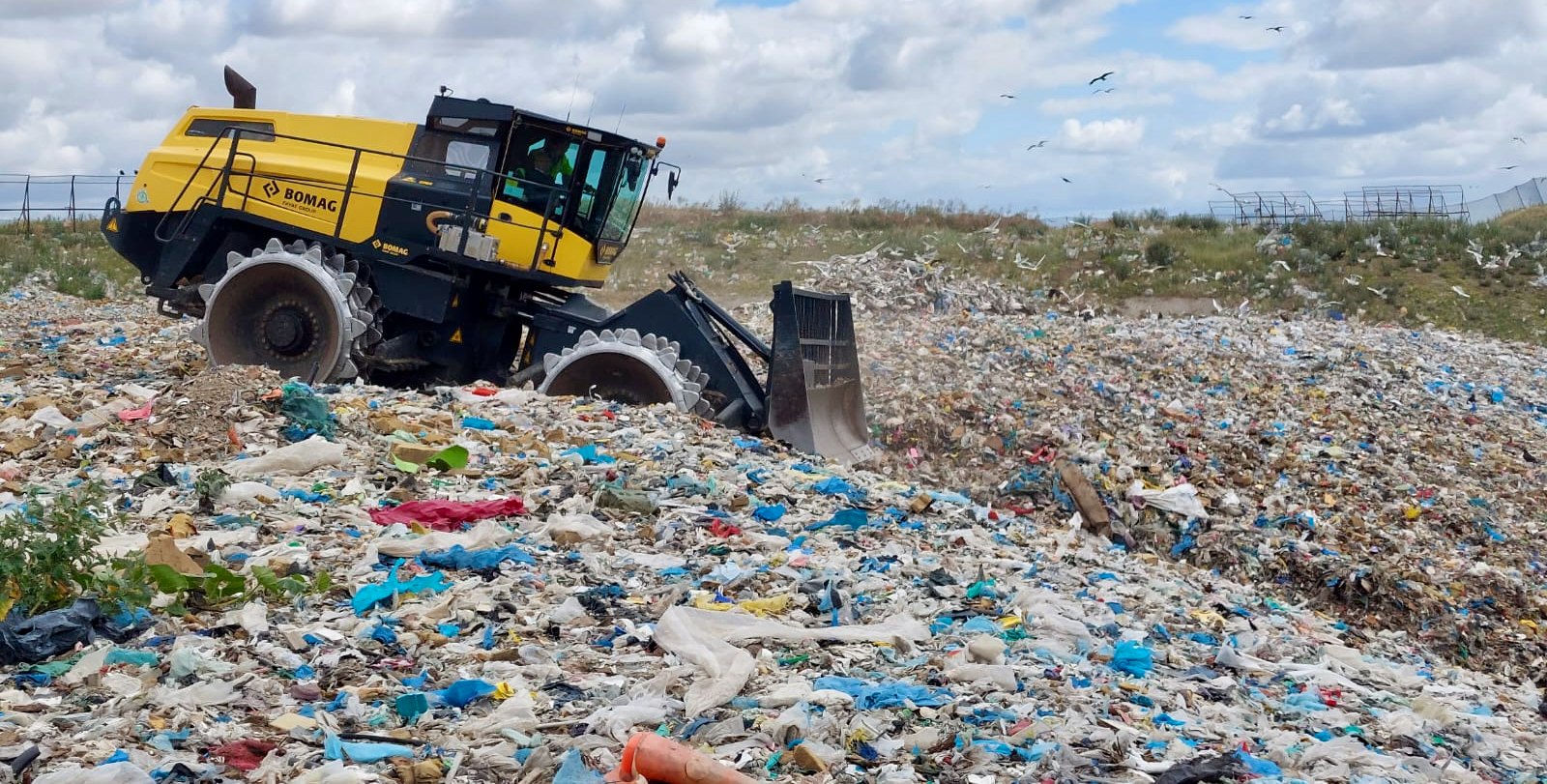 Mit einer schweren Maschine, die 45 Tonnen Eigengewicht und stählerne Reifen hat, pressen die Mitarbeiter diesen „Heizmüll“ regelmäßig zusammen. Auch Backhaus probierte das aus, samt Schrägfährt am Hang. Fangzäune ringsherum verhindern, dass zu viel leichter Plastikmüll wegweht.