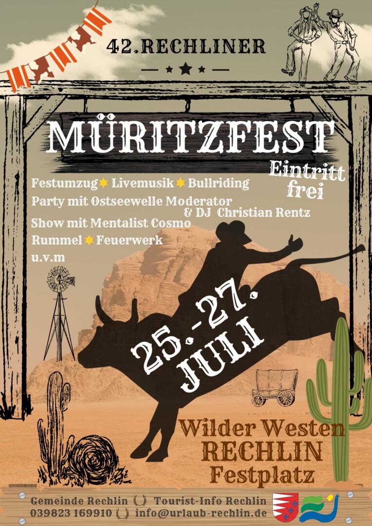 In der Reihe der Volksfeste diesen Sommer kann sich die Seenplatte auf ein weiteres Spektakel freuen. Der „Wilde Westen“ hält am kommenden Wochenende Einzug in Rechlin. Cowboys, Saloongirls, Apachenhäuptlinge, Rodeoreiter und viele mehr werden auf dem großen Festumzug in der Müritzstraße am Freitag den Auftakt geben. Auf dem Festplatz in der Fritz-Reuter-Straße gibt es dann neben dem alljährlichen Rummel auch Bullriding und anschließend Party mit DJ Andy und DJ Heiko.