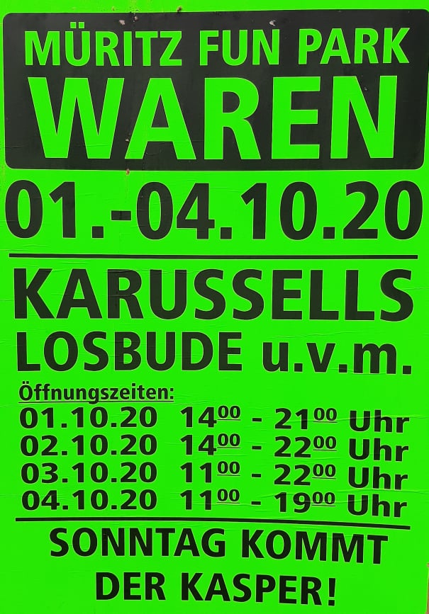 Ab morgen gibt’s in Waren ein bisschen Abwechslung: Schausteller haben den „Müritz Fun Park“ auf dem Festplatz am Kietz aufgebaut, unter anderem mit Break Dance, Scheibenwischer, Autoscooter, Losbude, Entenangeln , Kinder Bungee Trampolin, allerlei Leckereien und Kinderkarussell. Am Sonntag haben die Schaustelle Kinderschminken und Kasperler-Theater für große und kleine Besucher organisiert – kostenfrei.