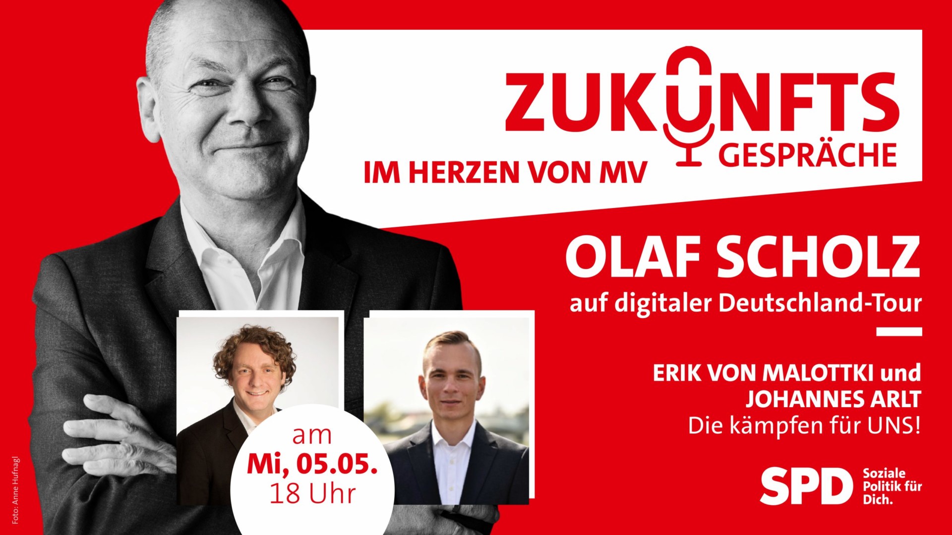 Für die Teilnahme wird kein weiteres Programm benötigt. Wer möchte, bereits Fragen unter www.johannesarlt-mv.de/scholzkommt stellen und sich vorab registrieren. Alle vorab gesammelten Fragen werden am Abend von den beiden Moderatoren Johannes Arlt und Erik von Malottki vorgelesen und von Olaf Scholz beantwortet.