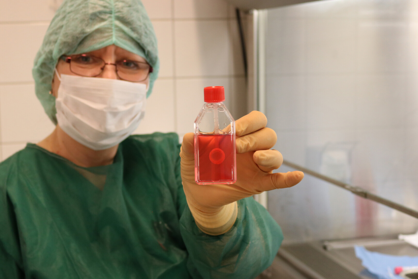 Bild: Eine Mitarbeiterin der Cornea Bank Rostock mit einem Hornhauttransplantat