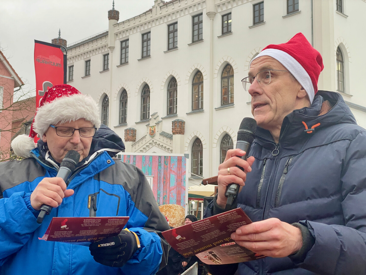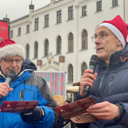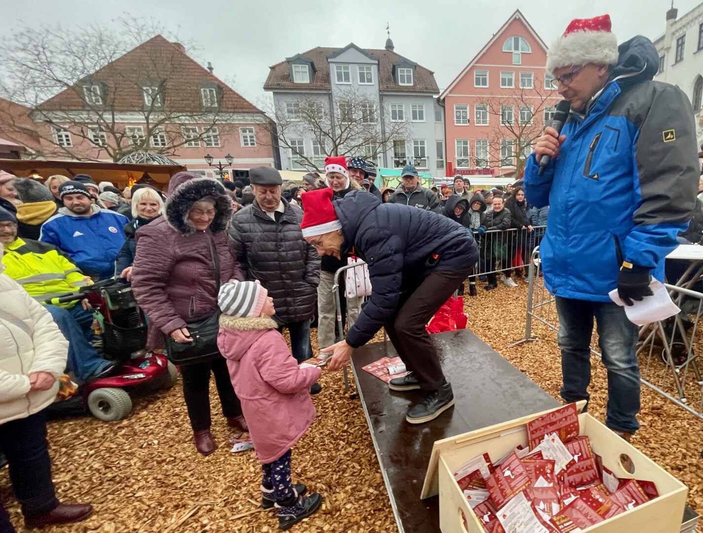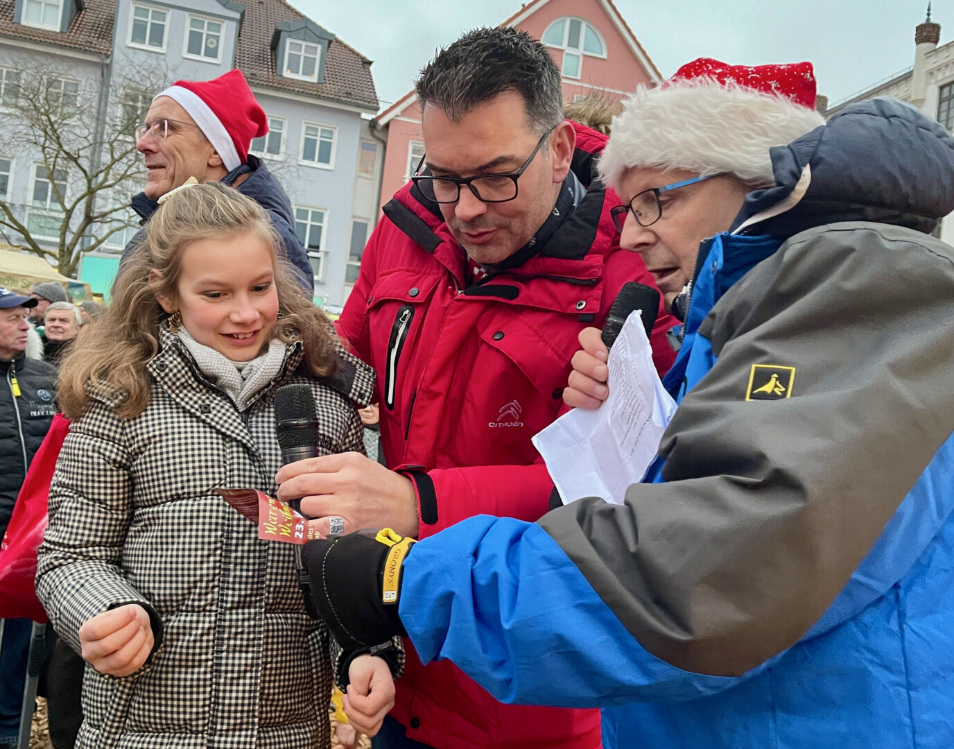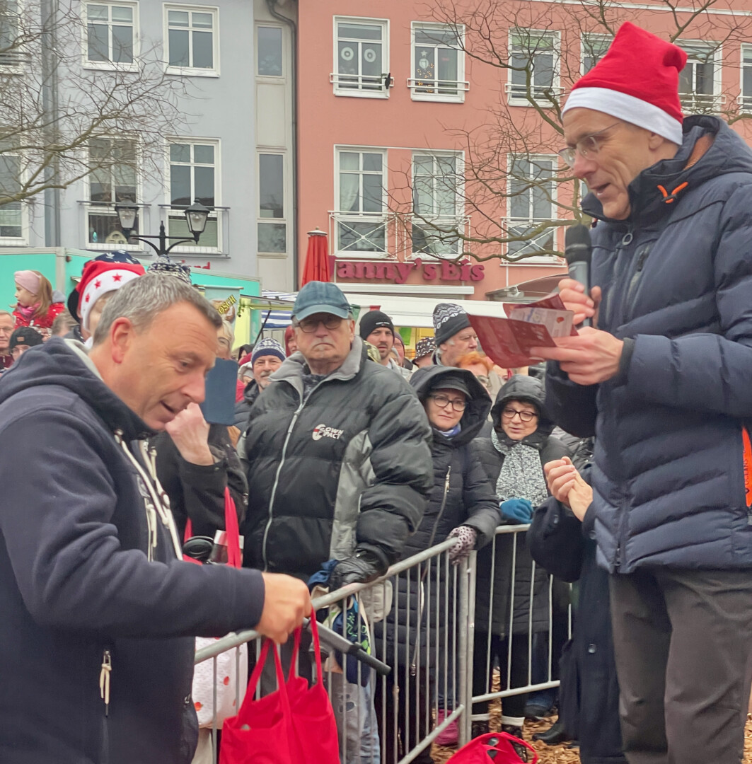 Neu in diesem Jahr: Neben Olaf Gaulke und Bürgermeister Norbert Möller moderierten Geschäftsführer und Unterstützer des Weihnachtsmarktes die Verlosung. Und so standen Mike Albrecht, Chef der WWG, Ulf Karberg vom gleichnamigen Zweiradhaus, Matze Wolter vom Autohaus Multhaup sowie Cornelia Runge als Chefin der Waren (Müritz)-Information auf der Bühne und hielten die vielen Besucher bei Laune. Das war bei Nieselregen und Wind auch bitter nötig.