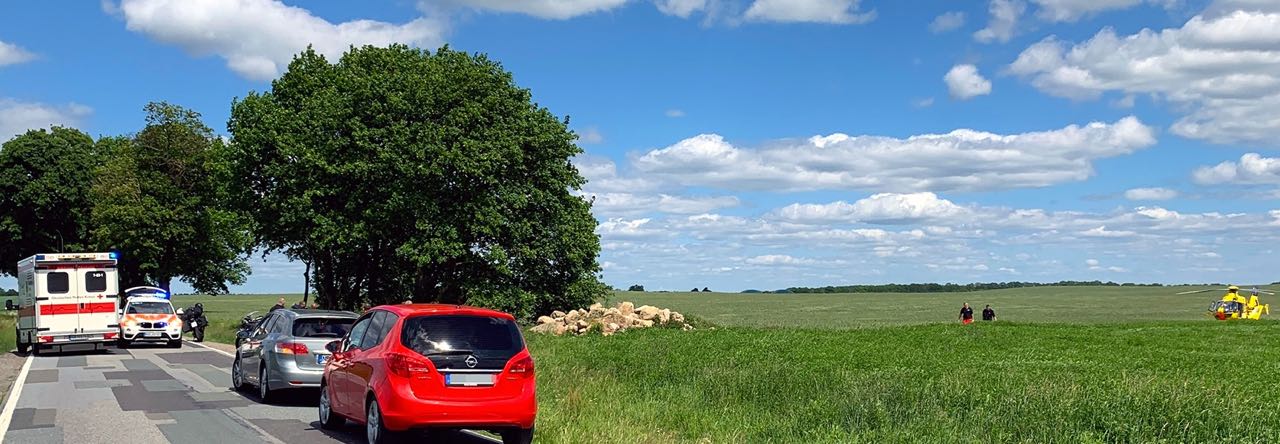 Der direkt hinter diesem Kradfahrer befindliche ebenfalls 56-jährige Kradfahrer bemerkte dies nicht, so dass es zum Zusammenstoß der beiden Kräder kam Beide stürzten. Der unfallverursachende Kradfahrer wurde durch den Sturz verletzt und hat vermutlich einen Schlüsselbeinbruch erlitten. Er musste mit dem Rettungshubschrauber in das Krankenhaus nach Plau gebracht werden.