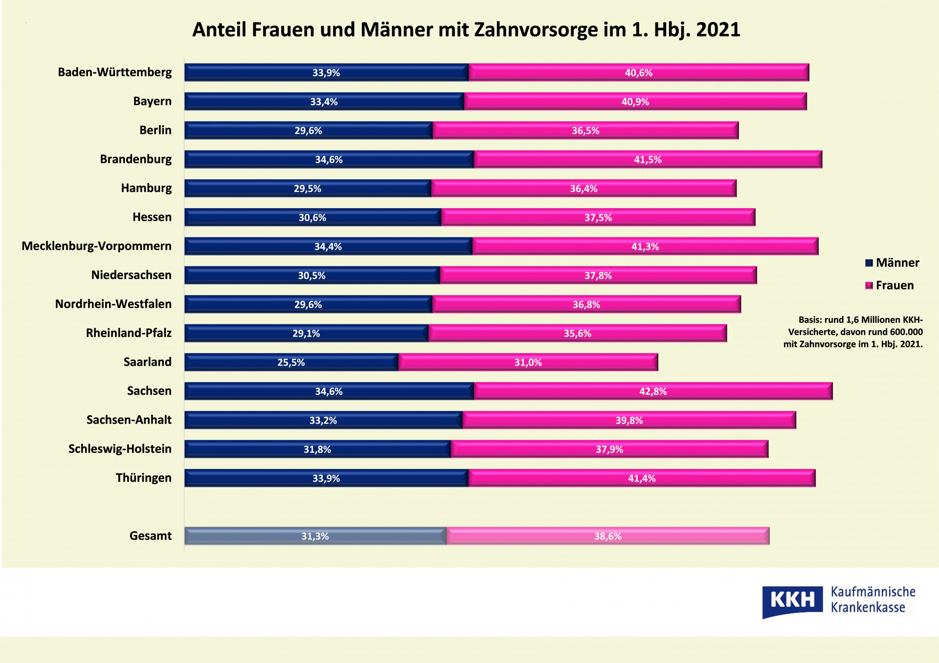 Insgesamt suchten im ersten Halbjahr des vergangenen Jahres rund 38 Prozent der KKH-Versicherten in Mecklenburg-Vorpommern den Zahnarzt zur Kontrolle auf. Das ist Platz drei im Ländervergleich. Der Bundesdurchschnitt lag bei rund 35 Prozent. Spitzenreiter sind nach wie vor die Sachsen mit mehr als 39 Prozent. Deutliches Schlusslicht sind die Saarländer, denn zwischen Hunsrück und Bliesgau ließen sich im ersten Halbjahr 2021 nur knapp 29 Prozent der Versicherten einen Termin zur Zahnvorsorge geben. Auch bei den Männern gibt es noch Nachholbedarf, denn in MV gehen ein Fünftel, bundesweit sogar rund ein Viertel mehr Frauen zur Zahnkontrolle als Männer.