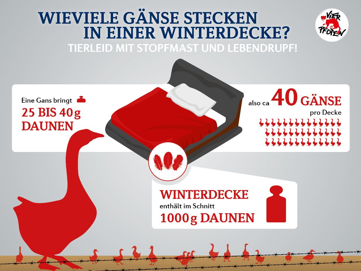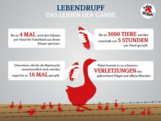Weitere Informationen: www.40lives.org. „40Lives“ steht für die 40 Gänse und Enten, die für eine einzelne Daunendecke gequält, gerupft oder gestopft werden.