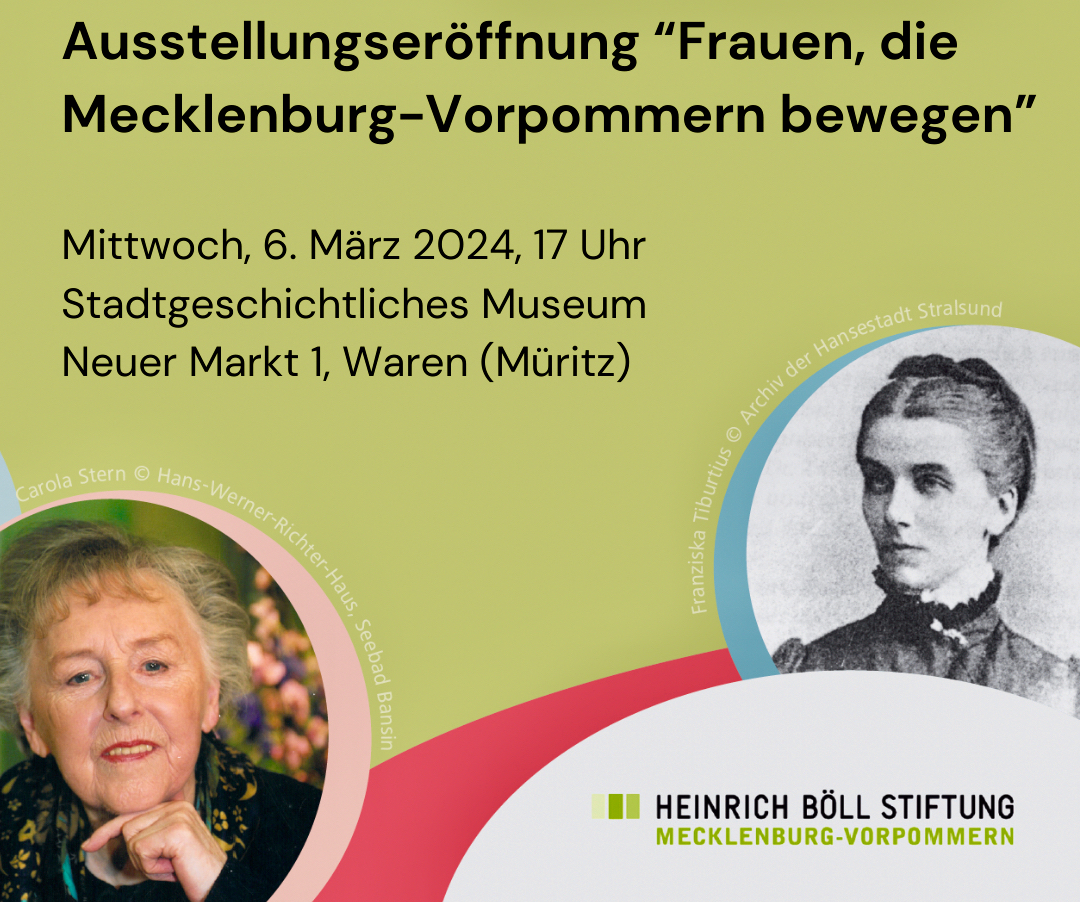 Die Ausstellung „Frauen, die Mecklenburg-Vorpommern bewegen“ der Heinrich-Böll-Stiftung MV will den Blick auf außergewöhnliche, engagierte und fortschrittliche Frauen aus unserer Region lenken. Es wird gezeigt, wie sich Frauen aus dem Norden für Gleichberechtigung, für Demokratie, für lebendige Kultur und für ein besseres Leben einsetzten und es noch immer tun. Im Warener Rathaussaal wird diese Ausstellung morgen, 6. März, um 17 Uhr eröffnet und kann dann bis 31. Mai besucht werden.