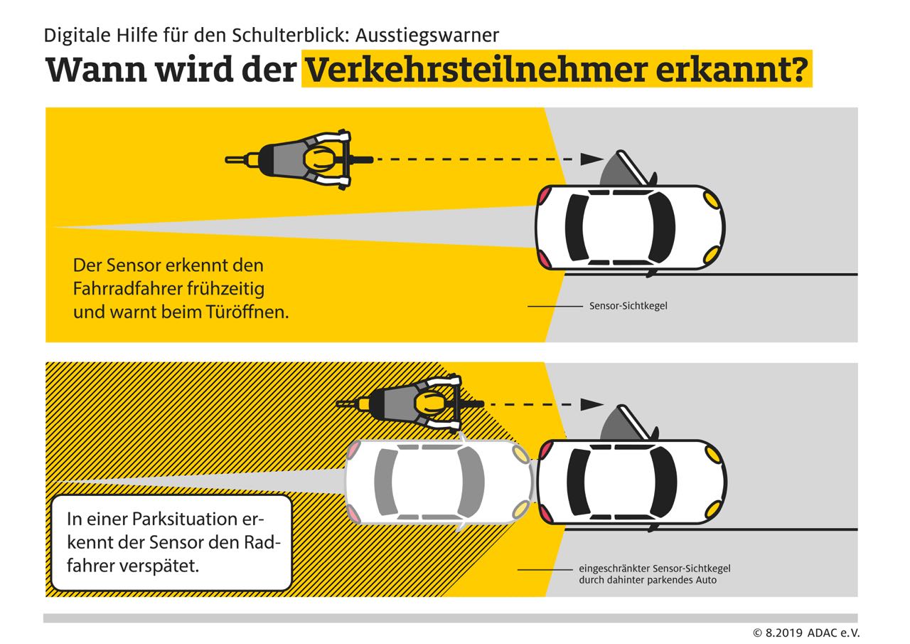 Auch wenn in der Parksituation mit verdecktem Sensor die Systeme nur eingeschränkt funktionieren, sind Ausstiegswarner aus Sicht des ADAC sinnvoll um Dooring-Unfälle zu vermeiden. In vielen Fahrzeugen ist die nötige Sensorik bereits mit einem Totwinkelassistenten verbaut und könnte vom Hersteller effizient genutzt werden. So können die Ausstiegswarner mit wenig Aufwand einen wichtigen Beitrag zur Verkehrssicherheit leisten – auch im Hinblick auf E-Scooter, die meist einen längeren Bremsweg haben als Fahrräder.
