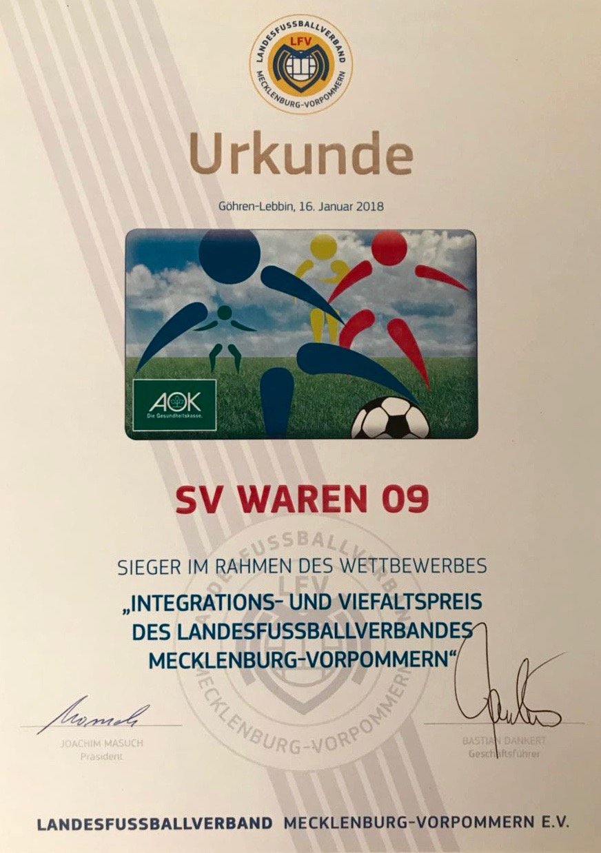 Der SV Waren 09 ist gestern Abend beim Neujahrsempfang des Landesfußballverbandes Mecklenburg-Vorpommern in Göhren-Lebbin als Sieger des Wettbewerbes „Integration- und Vielfaltspreis“ ausgezeichnet worden.