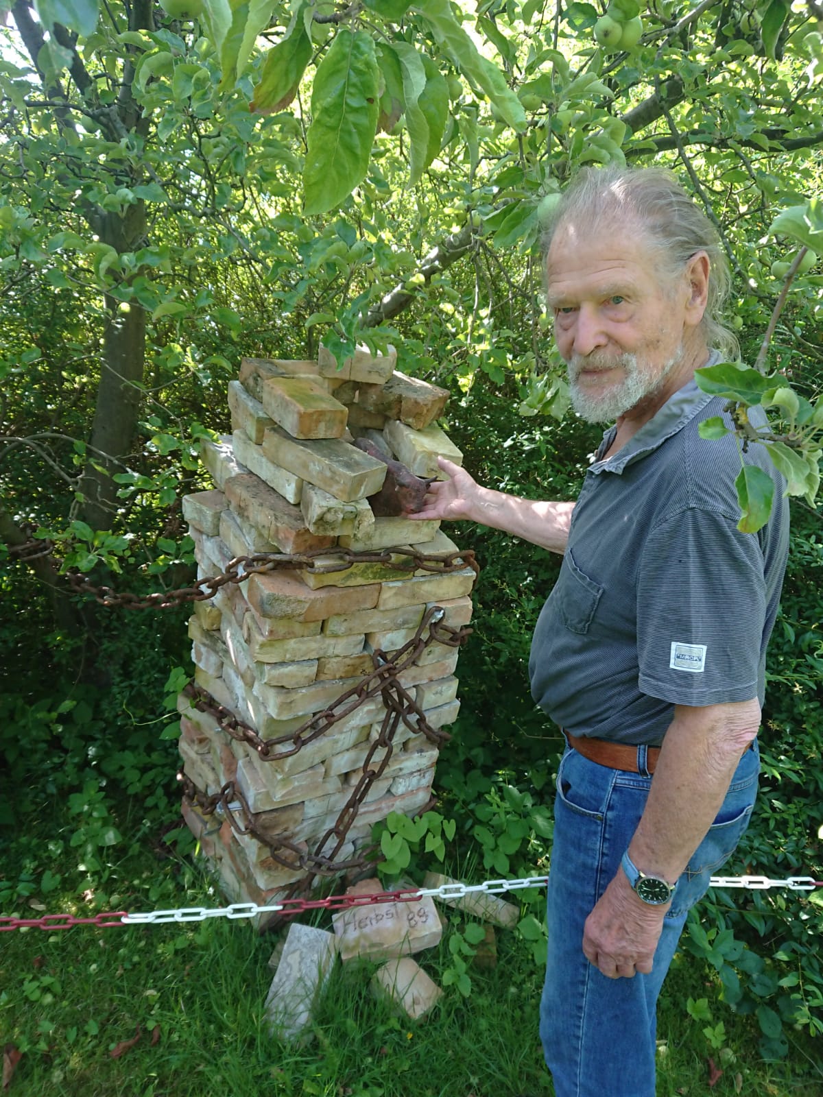 „Im Prinzip stürzte damals die ganze DDR ab“, sagt Franz Poppe bei einem kleinen Rundgang durch den Skulpturengarten am Ufer der Müritz in der Warener Gerhart-Hauptmann-Allee. Der über die Müritz-Region hinaus bekannte Kunsthandwerker, der auch für den Brunnen auf dem Neuen Markt die Verantwortung hatte, steht vor einer Mauersteinsäule, die von rostigen Ketten gehalten wird und scheinbar umzustürzen droht.