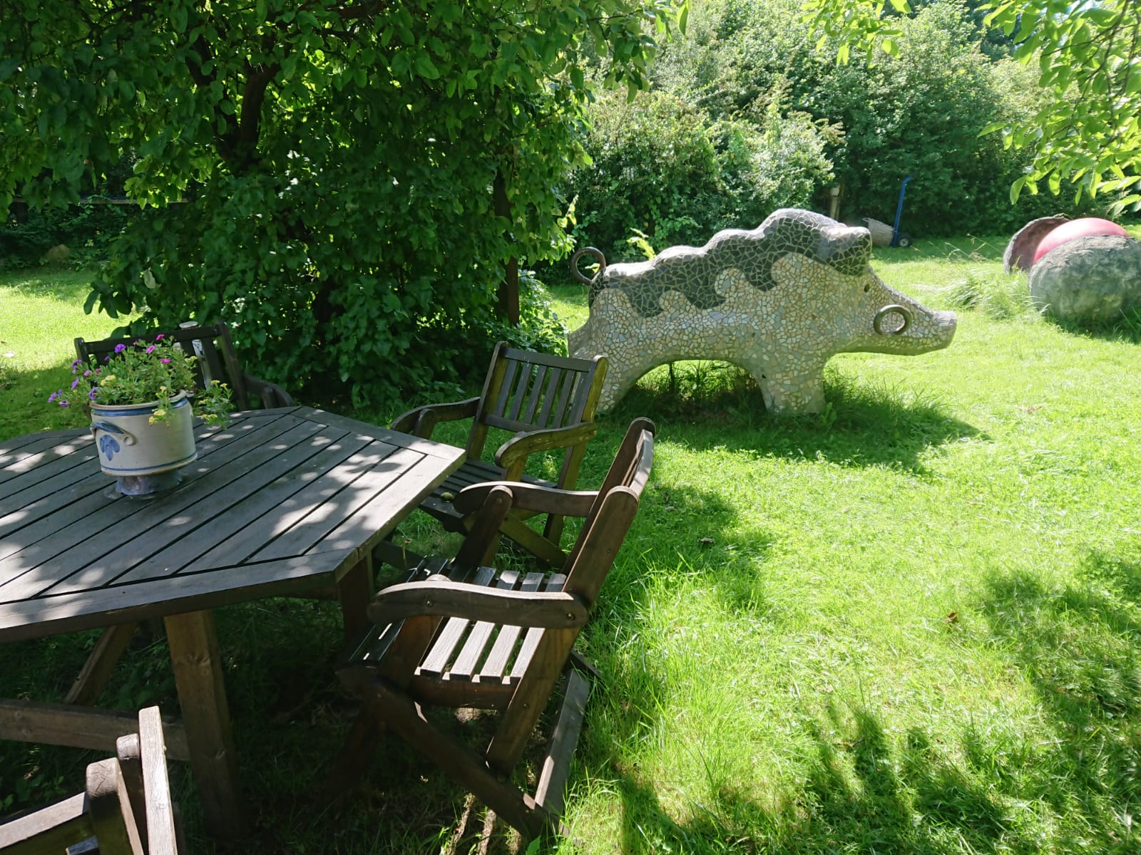Wenige Meter weiter im phantastischen Garten steht ein Warener Original: Das Wildschwein „Willi“, das jehrzehntelang als Klettergerüst für Kinder am Tiefwarensee diente. Poppe hat es ein bisschen saniert und mit kleinen Fliesen überzogen. „Wenn man es streichelt, wirkt das wie Borsten.“ Der „Willi“ durfte nicht mehr auf dem Spielplatz bleiben, er hätte keinen „TÜV“ mehr bekommen. Dafür stehen andere Tierfiguren Poppes noch: In Klink, in Schwerin, Sassnitz, Malchin oder in Neubrandenburg.