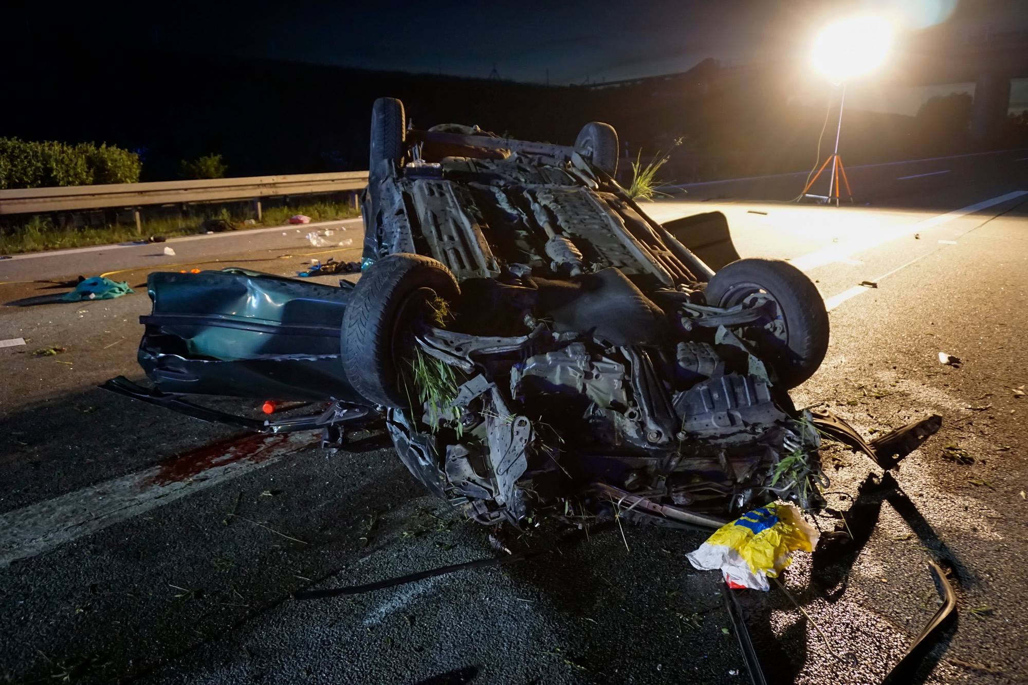 Laut Polizei war der 22-Jährige gegen 22 Uhr aus ungeklärter Ursache mit seinem Wagen nach rechts von der Autobahn abgekommen, hatte gegengelenkt, der Wagen überschlug sich mehrfach und blieb auf dem Dach liegen.