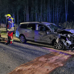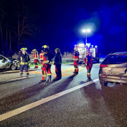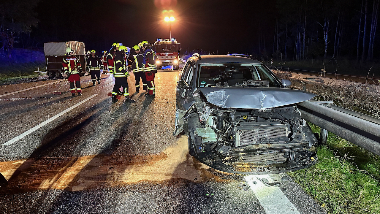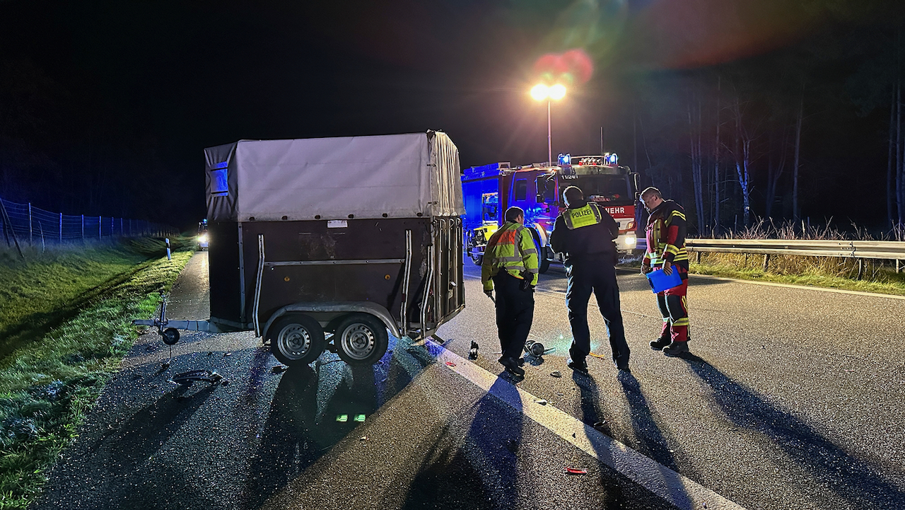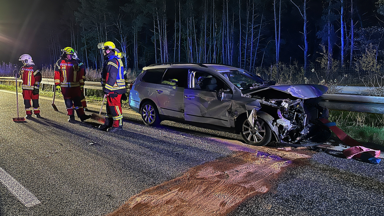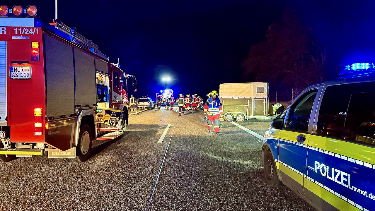 Kurz nach Mitternacht ist heute auf der A 19 an der Anschlussstelle Malchow in Richtung Berlin ein Pkw VW ungebremst auf einen Audi mit Pferdeanhänger gekracht. Die Fahrzeuge und die Trümmerteile blockierten die Fahrbahn. Der 30-jährige Fahrer des VW wurde leicht verletzt ins Krankenhaus gebracht. Im Anhänger stand ein Pferd, das ebenfalls verletzt in die Tierklinik musste. Für die Aufnahme der ausgelaufenen Betriebsstoffe unterstützten die Freiwilligen Feuerwehren aus Malchow und Alt Schwerin mit 30 Kameraden und 6 Einsatzfahrzeugen. Anrückende Rettungskräfte beklagten die fehlende Rettungsgasse zum Unfallort. Laut Feuerwehr handelte es sich größtenteils um Lkw-Fahrer, die die Gasse mit ihren 40-Tonnern versperrten. Die nicht mehr fahrbereiten Fahrzeuge wurden abgeschleppt. Den Sachschaden schätzt de Polizei auf rund 50 000 Euro. Zur medizinischen Versorgung, Unfallaufnahme und Bergung der Fahrzeuge musste die A 19 für 2,5 Stunden voll gesperrt werden.