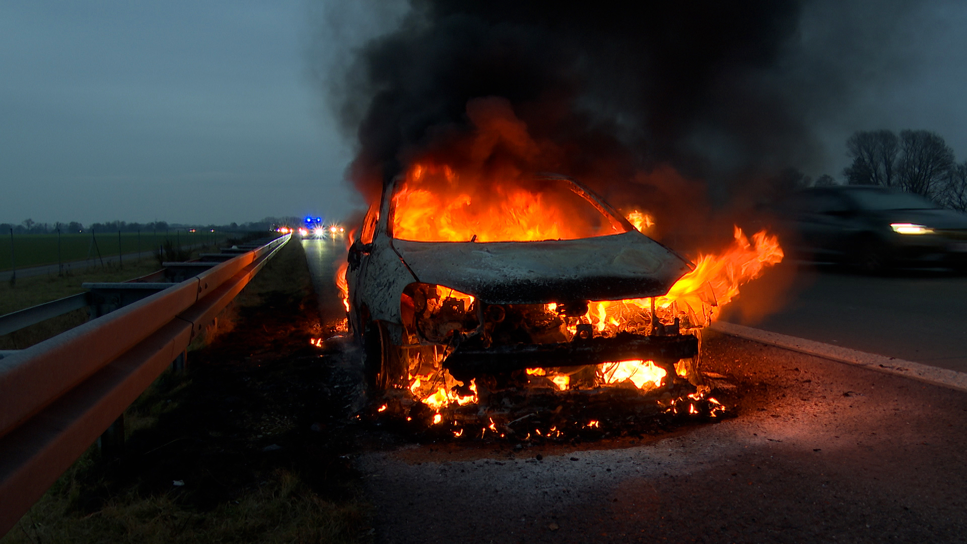 Nur wenige Minuten später stand der Wagen dann schon komplett in Flammen. Die Autobahn in Richtung Berlin wurde aufgrund der Rauchentwicklung gesperrt. Einsatzkräfte der Feuerwehr löschten den Kleinwagen mittels Schaum ab. Durch die enorme Hitzeentwicklung wurde auch die Fahrbahn in Mitleidenschaft gezogen.