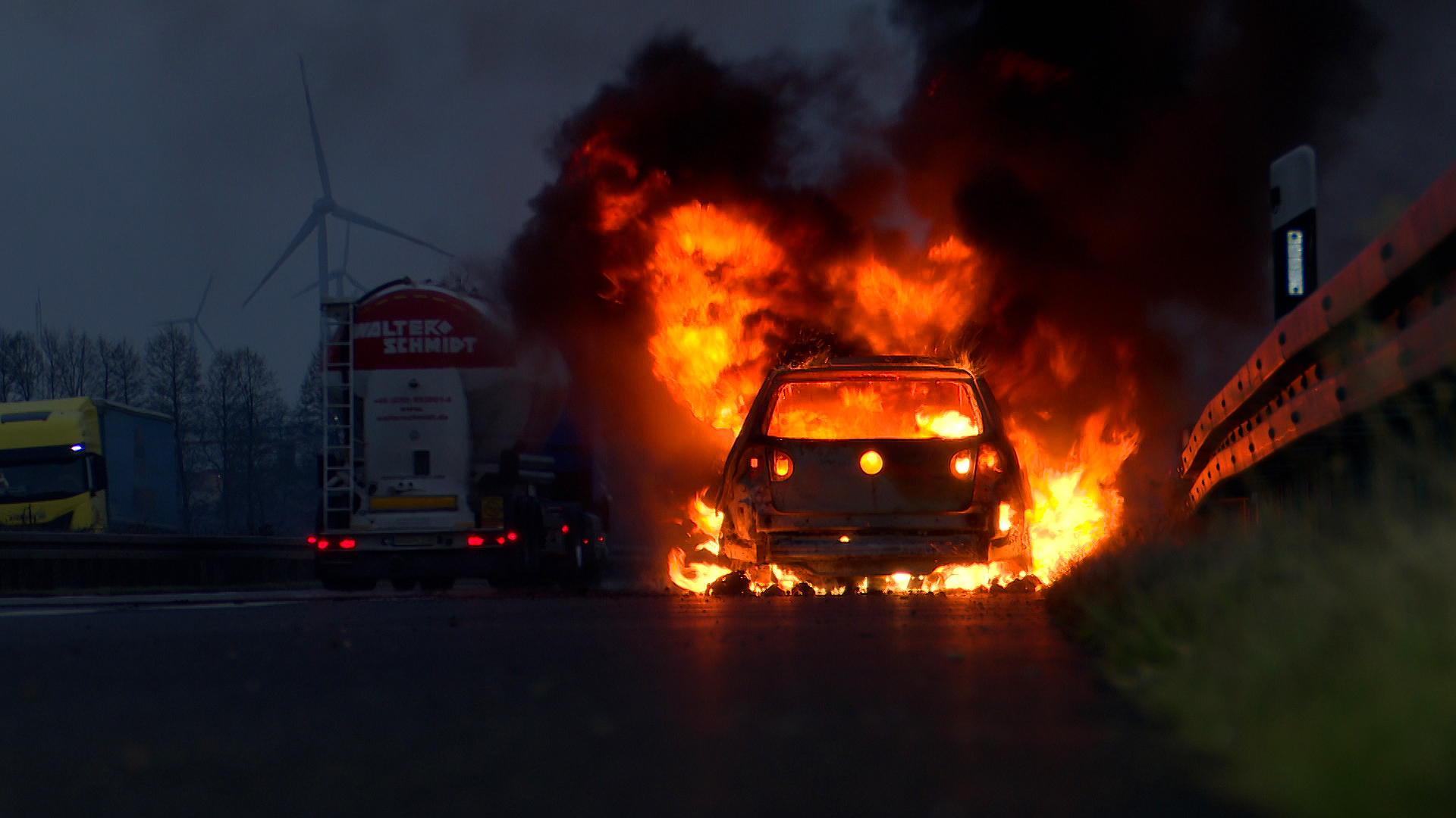 Nur wenige Minuten später stand der Wagen dann schon komplett in Flammen. Die Autobahn in Richtung Berlin wurde aufgrund der Rauchentwicklung gesperrt. Einsatzkräfte der Feuerwehr löschten den Kleinwagen mittels Schaum ab. Durch die enorme Hitzeentwicklung wurde auch die Fahrbahn in Mitleidenschaft gezogen.
