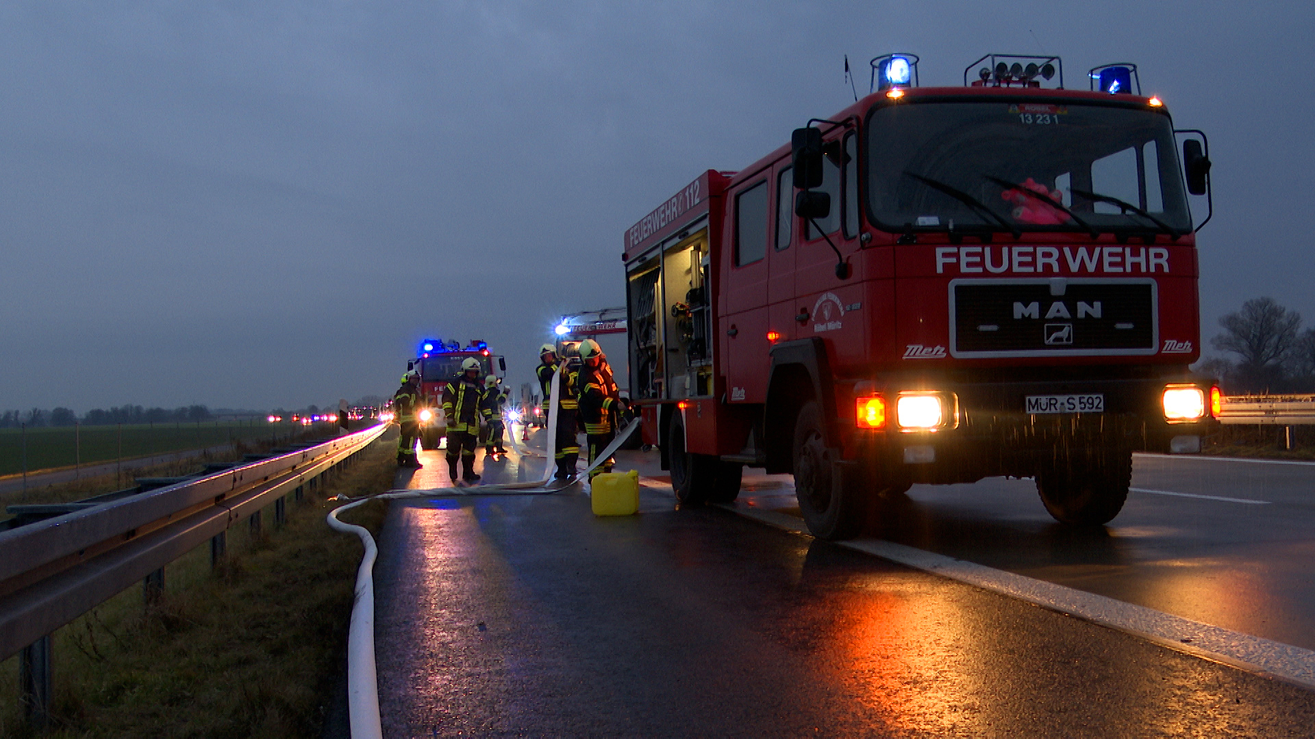 Die Feuerwehr Röbel traf bei der Anfahrt zum Brandort auf einen Unfall, der sich erst kurz zuvor ereignet hatte. Verletzt wurde hierbei niemand, und der verunfallte Wagen stand auf dem Standstreifen der Autobahn. So konnten die Einsatzkräfte ihren Weg zum brennenden Pkw fortsetzen.
