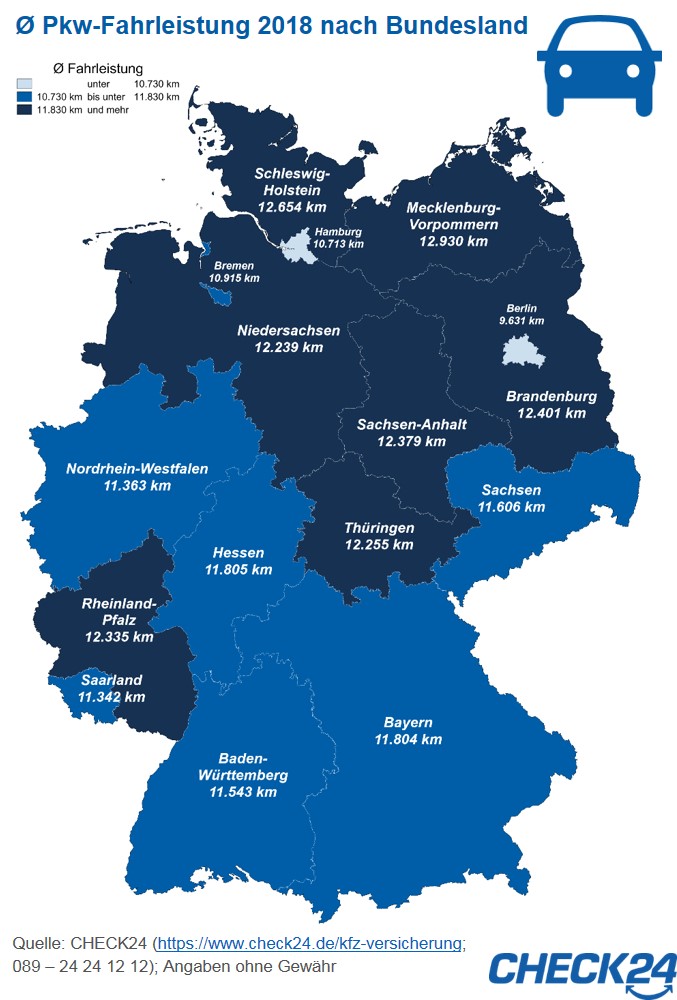 Autofahrer aus Mecklenburg-Vorpommern legen im Jahr durchschnittlich 12.930 Kilometer zurück. Das sind 3.299 Kilometer bzw. 34 Prozent mehr als Berliner Fahrer (Ø 9.631 Kilometer). Im Bundesdurchschnitt fahren CHECK24-Kunden nach eigener Auskunft jährlich 11.672 Kilometer.*)