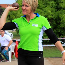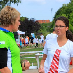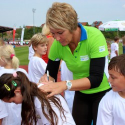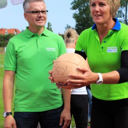 „Ich mache ja viel Sport, aber diese Disziplinen sind auch für mich eine Herausforderung. Das gibt Muskelkater“, gab Norbert Möller zu. Die „Promis“ mussten zunächst einen Zwei-Kilo-Medizinball werfen, dann Seil springen und schließlich beim Kugelstoßen überzeugen. Klar, dass Astrid Kumbernuss in dieser Disziplin alle anderen hinter sich ließ. Obwohl sie die Kugel nur noch selten in die Hand nimmt. „Ich mache zwar noch Sport, um fit zu bleiben, aber Kugelstoßen gar nicht mehr“, sagte die sympathische Sportlerin, die heute bei der Barmer GEK als Marketingexpertin arbeitet. Dass sie auch nach ihrer aktiven Laufbahn beliebt und bekannt ist, hat sie im Müritzstadion heute einmal mehr erfahren. Sie gab jede Menge Autogramme auf T-Shirts und wurde um etliche gemeinsame Fotos gebeten.