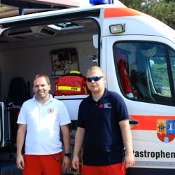 Nicht zum Sport machen, sondern eher zum Kühlen waren DRK-Rettungsassistent Torsten Hahn und Philipp Preisinger vom DRK-Betreuungsdienst im Stadion. Sie mussten nach den ersten Stunden schon Nachschub anfordern, denn Eisbeutel wurden so einige gebraucht. „Meistens haben sich die Sportler nicht richtig warm gemacht und sich dann verletzt“, so Torsten Hahn. Ein Kind musste auch ins Krankenhaus. Es war von der Hüpfburg gestürzt und hat sich dabei an der Nase weh getan.