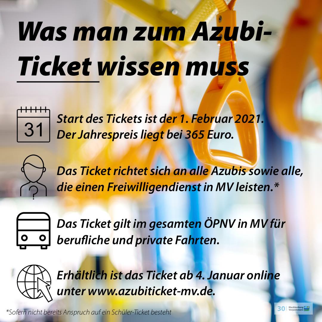 Zum 1. Februar 2021 wird in Mecklenburg-Vorpommern das landesweite Azubi-Ticket eingeführt. Es gilt das ganze Jahr für den gesamten öffentlichen Personennahverkehr im Land, also in allen Zügen des Nahverkehrs, Bussen und Straßenbahnen. Es richte sich an alle Auszubildenden sowie alle, die einen Freiwilligendienst in Mecklenburg-Vorpommern leisteten, sofern nicht schon heute ein Anspruch auf ein Schülerticket bestehe. Das Ticket kann nicht nur für den Weg zur Berufsschule oder zum Ausbildungsbetrieb, sondern auch für private Zwecke genutzt werden und kostet 365 Euro im Jahr, also einen Euro pro Tag.