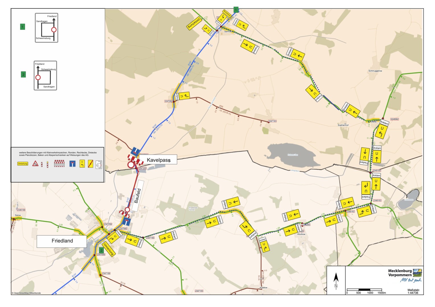 Eine Umleitung für den Durchgangsverkehr wird ausgeschildert ab Friedland über die Landesstraßen L 28 (Schwichtenberg), L 331 und L 31 (Löwitz) nach Sarnow sowie umgekehrt (siehe Umleitungsplan unten).