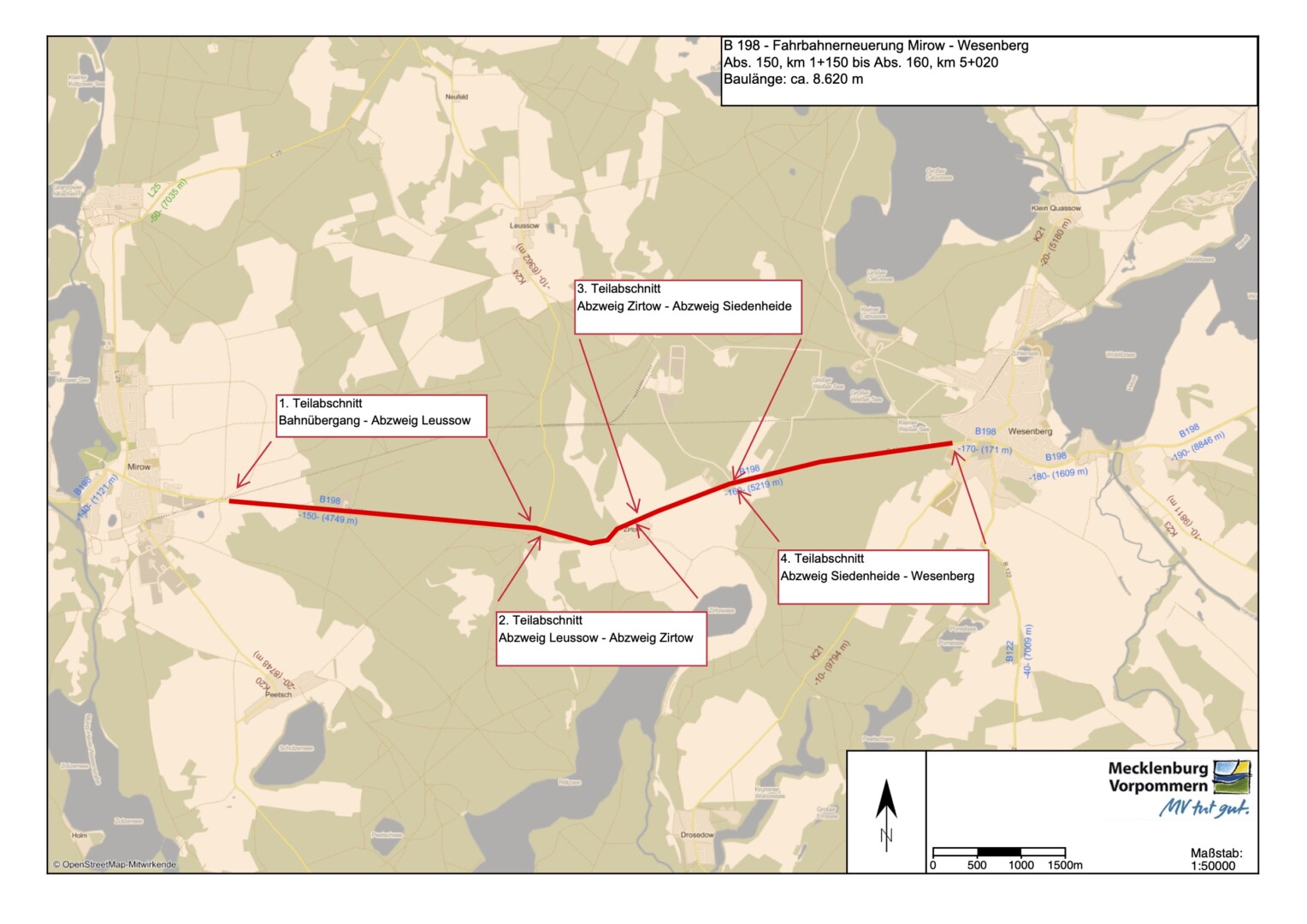 Das Straßenbauamt Neustrelitz lässt an der Bundesstraße 198 die Fahrbahn zwischen Mirow und Wesenberg erneuern. Der knapp neun Kilometer lange Abschnitt habe das Ende seiner Nutzungsdauer erreicht. Unebenheiten im Längs- und Querprofil, zahlreiche Flickstellen und fortschreitende Rissbildung kennzeichnen hier die Fahrbahn, die damit instandsetzungsbedürftig sei. Die Bauarbeiten starten am Montag, 5. Mai , zunächst mit der Demontage der Schutzplanken im Baufeld. Für die Durchführung dieser Arbeiten sind halbseitige Verkehrsführungen mittels Ampel-Regelung erforderlich. Für die anschließenden Fräs- und Asphaltarbeiten muss der gesamte Baubereich für den Durchgangsverkehr von Montag, 12. Mai, bis voraussichtlich Mittwoch, 24. Juni, voll gesperrt werden. Spätestens zum einsetzenden Anreiseverkehr für das Fusion-Festival in Lärz ab Donnerstag, 25. Juni, sollen sämtliche Asphaltarbeiten beendet sein. Auch zu Christi Himmelfahrt (28. Mai bis 1. Juni) und Pfingsten (6. Juni bis 10. Juni) wird es eine Unterbrechung der Bautätigkeiten geben und per Sonderregelungen eine zweistreifige Befahrbarkeit des Baufeldes ermöglicht.