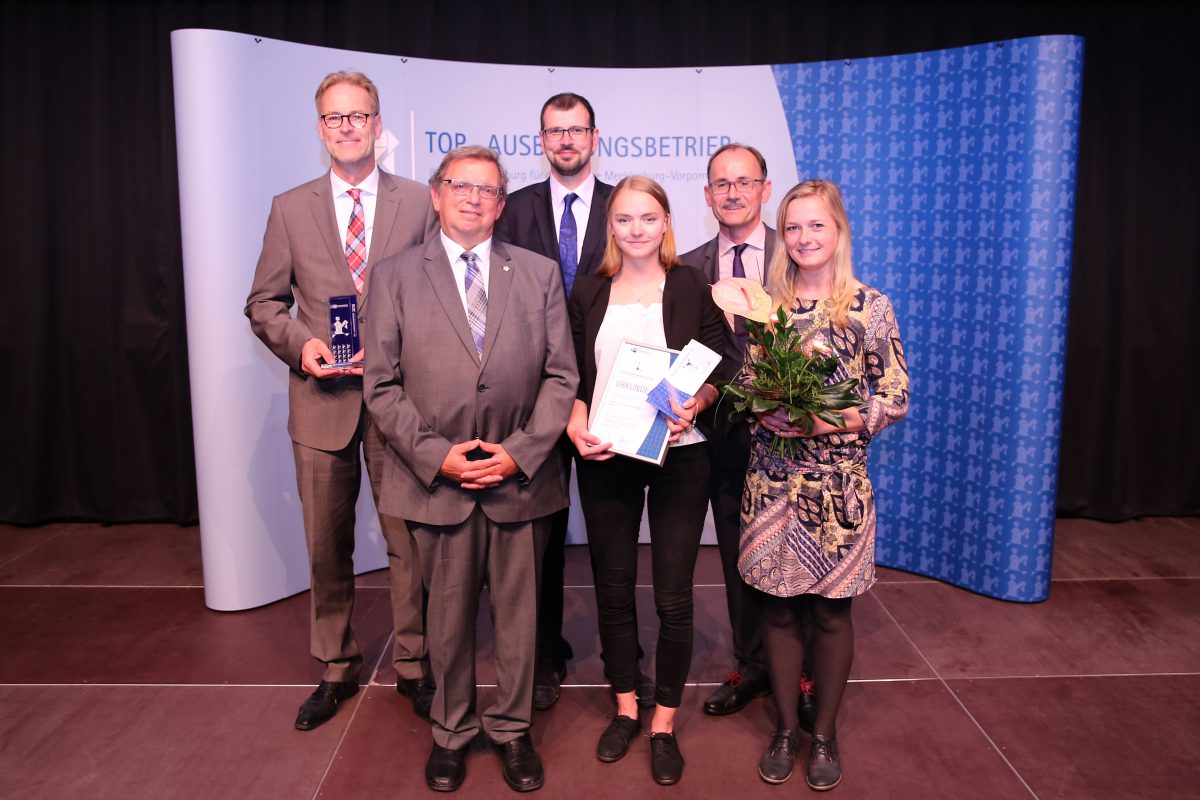 Die Auszeichnung haben Marketingchef Torsten Brandt (links), Henrike Tack, Auszubildende für Marketing & Kommunikation (vorne Mitte) und Personalreferentin Kristin Maltzahn (rechts) von IHK-Präsident Dr. Wolfgang Blank, Staatssekretär Steffen Freiberg und IHK-Vizepräsident Manfred Urban (vorne links) entgegen genommen.