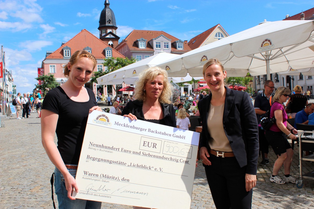 Waren. Ein weiterer Hoffnungsstrahl für die Warener Begegnungsstätte „Lichtblick“: Die Leiterin der Einrichtung, Birgit Gadau, konnte in dieser Woche einen dicken Scheck in Empfang nehmen. Und der kam von der Mecklenburger Backstuben GmbH, besser gesagt, von den Kunden des Traditionsbäckers. Denn das Warener Unternehmen startete zum 750. Geburtstag der Stadt Waren gleich drei außergewöhnliche Aktionen und sammelte damit für die Begegnungsstätte.