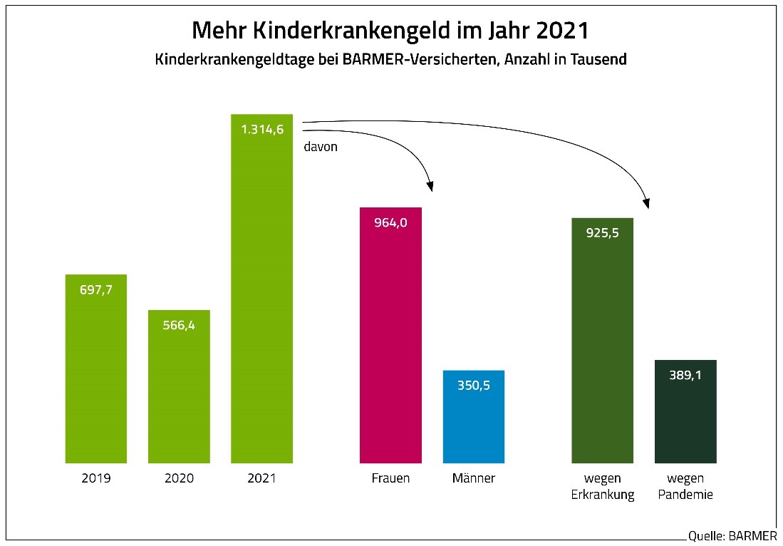 Die Zahl der Kinderkrankengeldtage hat im Jahr 2021 massiv zugenommen. Das geht aus einer aktuellen Analyse der BARMER hervor. Insgesamt bewilligte die Kasse im Jahr 2021 rund 1,31 Millionen Kinderkrankengeldtage und somit mehr als doppelt so viele als im Vorjahr mit rund 566.000 Tagen. „Das Kinderkrankengeld entlastet Eltern, die ihre Kinder aufgrund einer Erkrankung oder pandemiebedingt selbst betreuen müssen. Es hat sich damit gerade in Krisenzeiten hervorragend bewährt“, sagt Prof. Dr. Christoph Straub, Vorstandsvorsitzender der BARMER. Auch im Jahr 2019 hätten die bewilligten Zahltage mit rund 698.000 unter dem Ergebnis des Jahres 2021 gelegen. Etwa 30 Prozent der Gesamtzahltage im Jahr 2021 seien dabei auf das pandemiebedingte Kinderkrankengeld entfallen. Dieses hätten im Jahr 2021 erstmalig Eltern nutzen können, deren Kinder aufgrund pandemiebedingter Maßnahmen wie Schul- und Kitaschließungen betreut werden mussten.