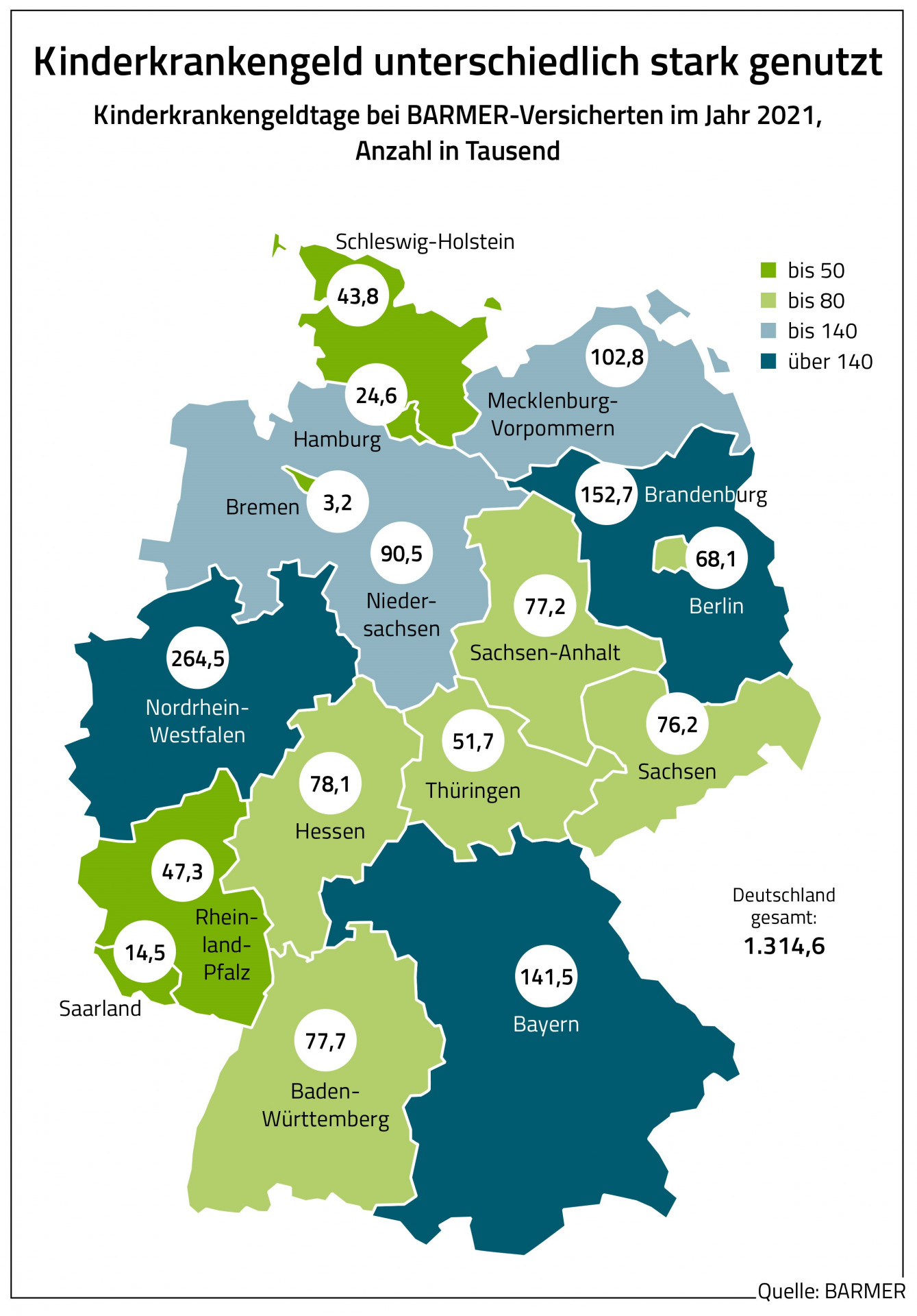 Mit rund 265.000 Zahltagen wurde das Kinderkrankengeld laut der BARMER-Analyse in Nordrhein-Westfalen am häufigsten in Anspruch genommen. Deutlich seltener wurde die Leistung hingegen in Bremen mit rund 3.200 Kinderkrankengeldtagen genutzt.
