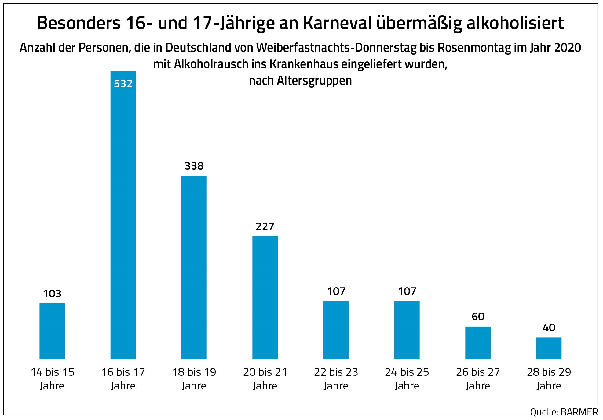 Vor allem 16- und 17-Jährige müssen an den Karnevalstagen ins Krankenhaus, weil sie zu viel Alkohol getrunken haben. Das geht aus einer Analyse des BARMER Instituts für Gesundheitssystemforschung bifg hervor. Im Jahr 2020 wurden demnach bundesweit 532 Teenager an Karneval stark alkoholisiert ins Krankenhaus gebracht. In den nachfolgenden Altersgruppen sanken die Zahlen rapide ab. Beispielsweise waren es unter den 22- bis 23-Jährigen nur 107 Personen, die wegen eines Alkoholrausches stationär behandelt werden mussten. „Junge Menschen wissen bei Alkohol häufig noch nicht, wo ihre Grenzen sind. Daher sollten alle Erziehungsberechtigten immer wieder auf die Gefahren von übermäßigem Alkoholkonsum hinweisen. Es geht darum, die Jugendlichen zumindest auf die Risiken von Alkohol hin zu sensibilisieren“, sagt Dr. Ursula Marschall, Leitende Medizinerin bei der BARMER.