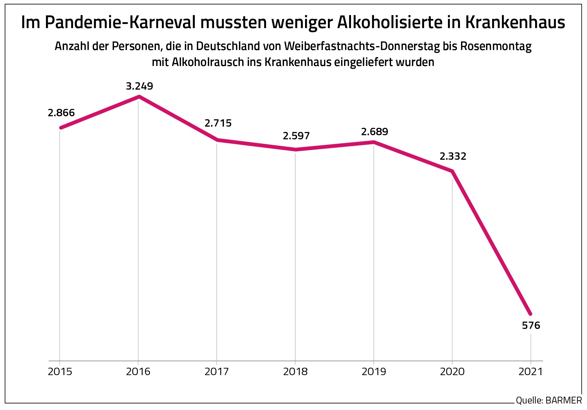 Wie aus der BARMER-Analyse weiter hervorgeht, kamen von Weiberfastnacht bis Rosenmontag des Jahres 2020 bundesweit 2.332 Menschen wegen übermäßigem Alkoholkonsum ins Krankenhaus. Im Jahr 2021 sank die Zahl auf 576 Betroffene, was einem Rückgang von fast 75 Prozent entspricht.