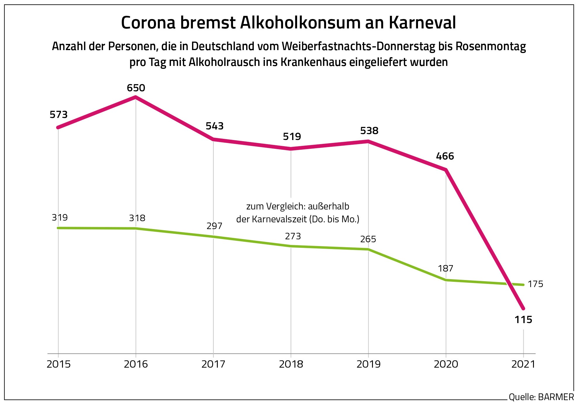 „Wegen des Lockdowns kamen während des letzten Karnevals viel weniger Menschen als im Vorjahr wegen Alkoholmissbrauchs ins Krankenhaus. Die Fallzahlen lagen sogar unter dem Jahresdurchschnitt“, so Marschall. So seien während der wichtigsten Karnevalstage, von Donnerstag bis Montag, im Schnitt 115 Personen täglich stationär behandelt worden. Über das komplette Jahr betrachtet seien von Donnerstag bis Montag dagegen durchschnittlich 175 stark Alkoholisierte je Tag ins Krankenhaus gekommen. Dieser vergleichsweise höhere Wert könne an dem zeitweisen Ende der Corona-Beschränkungen liegen.