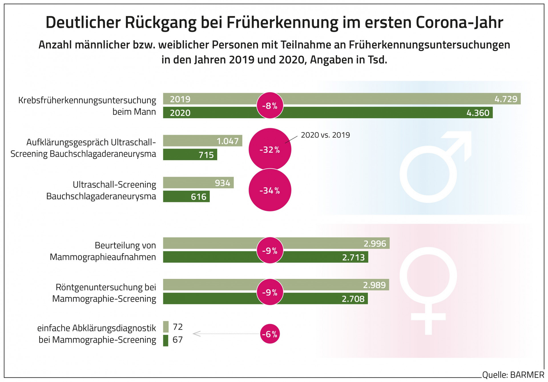 Laut BARMER-Arztreport ist vom Jahr 2019 auf 2020 allein die Zahl der Gesundheitsuntersuchungen bei Erwachsenen von rund 11,7 Millionen auf 7,4 Millionen in Deutschland zurückgegangen. Das entspricht einem Minus von 37 Prozent.