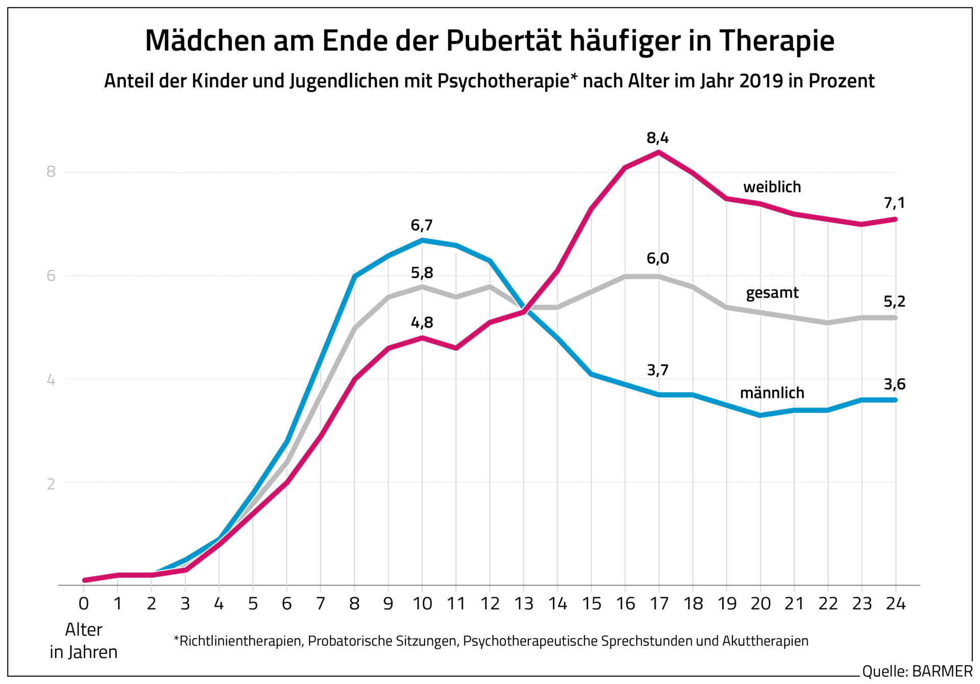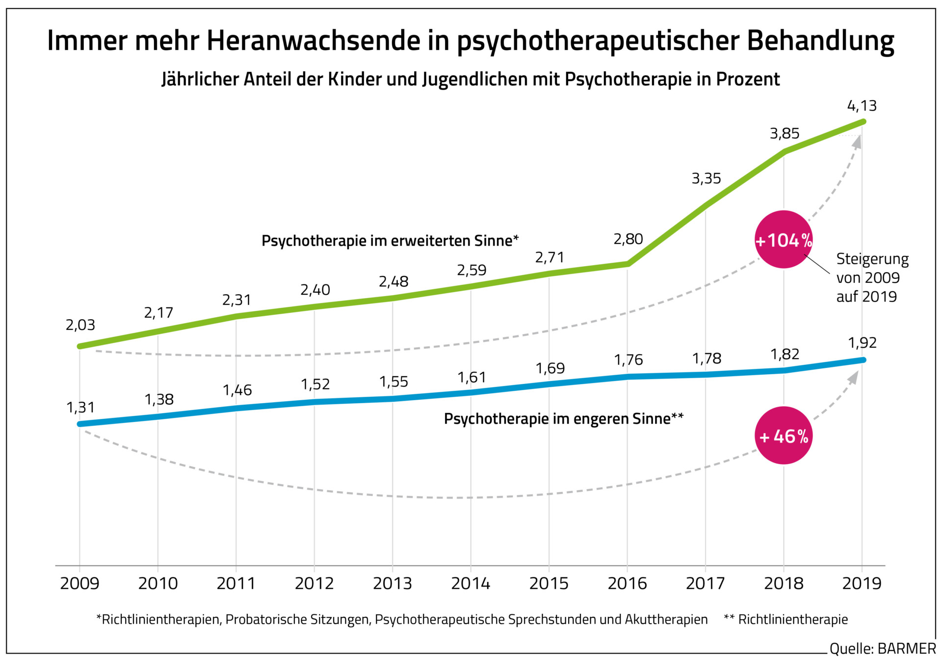 „Die Betroffenen dürfen von einer Psychotherapie keine Wunder erwarten. Sie ist ein steiniger und beschwerlicher Weg. Je früher die Kinder und Jugendlichen aber professionelle Hilfe bekommen, desto größer ist die Chance auf einen minder schweren Verlauf“, so BARMER-Chef Straub. Schließlich werde die Behandlung schwieriger und langwieriger, sollten sich die Probleme chronifiziert haben. So seien zum Beispiel bei 62,5 Prozent aller Betroffenen auch noch fünf Jahre nach Start der Psychotherapie psychische Störungen diagnostiziert worden.