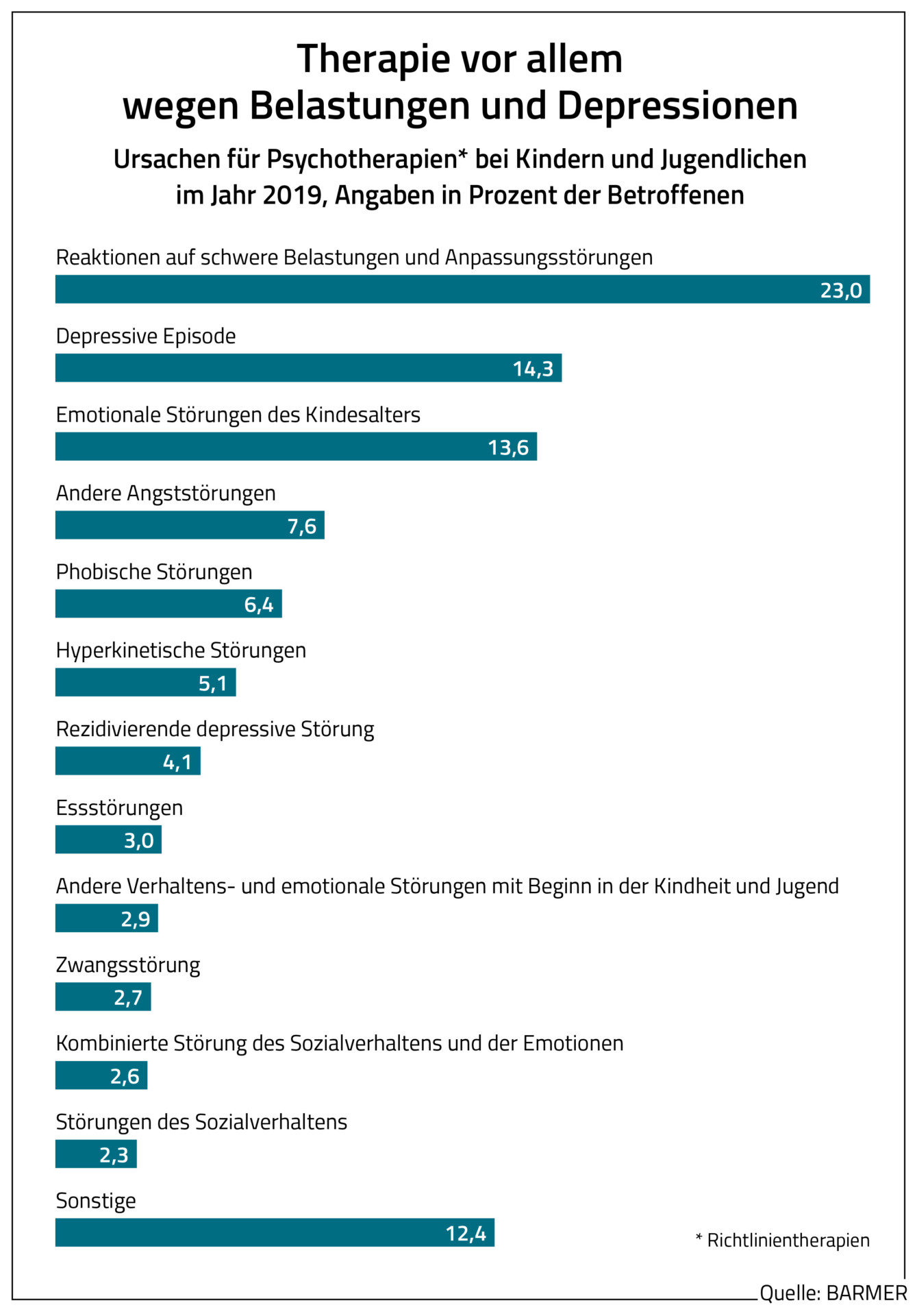 Die Angebote der BARMER sollten dazu beitragen, dass sich psychische Probleme nicht verfestigten, so der BARMER-Vorstandsvorsitzende weiter. Gleichwohl sei eine Therapie nicht immer vermeidbar. Den Ergebnissen des Arztreports zufolge hätten im Jahr 2019 rund 162.300 Kinder und Jugendliche erstmals eine Richtlinientherapie erhalten. Die Ursachen dafür seien sehr unterschiedlich. In knapp 37.400 Fällen seien Reaktionen auf schwere Belastungen und Anpassungsstörungen ausschlaggebend. Dafür gebe es viele Ursachen, angefangen von Trauererlebnissen bis hin zum Mobbing. „Junge Menschen sind heutzutage vielen Belastungen ausgesetzt, die der Psyche zusetzen können. Bis zu welchen Grad einzelne Faktoren wie Mobbing eine Rolle spielen, lässt sich aber nicht genau bemessen“, sagt Szecsenyi. Die zweithäufigste Ursache für eine erstmalige Therapie seien im Jahr 2019 Depressionen, und zwar in rund 23.100 Fällen gewesen, gefolgt von emotionalen Störungen im Kindesalter in gut 22.000 Fällen.