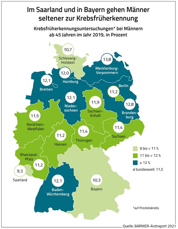 Laut der Analyse gibt es deutliche regionale Unterschiede bei der Inanspruchnahme von Früherkennungsuntersuchungen auf Gebärmutterhals- und Brustkrebs bei Frauen sowie auf Prostatakrebs bei Männern. Im Analysezeitraum wiesen bei Frauen das Saarland (36,5 Prozent) und Niedersachsen (38,3 Prozent) die niedrigsten Untersuchungsraten auf. In den ostdeutschen Flächenländern waren die Raten dagegen merklich höher. So war Brandenburg Spitzenreiter mit 42,8 Prozent. Bei den Männern variierten die Unterschiede zwischen den Bundesländern stärker. Die geringsten Raten gab es im Saarland (9,3 Prozent) und in Bayern (10,3 Prozent).